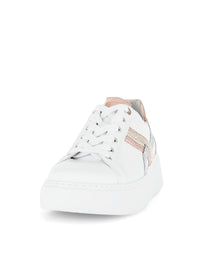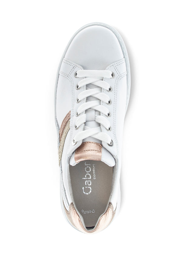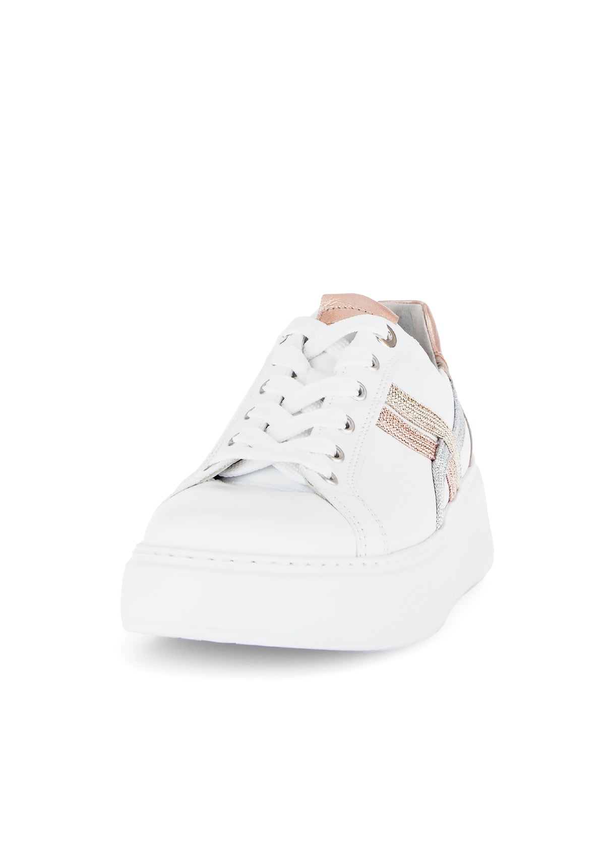 Mageet paksupohjaiset tennarit Gaborilta! Trendikäs paksu pohja ja valkoinen nahka on tyylikäs yhdistelmä. Metallinsävyiset koristenauhakuvioinnit sivuilla ja takaosan ruusukulta ja beige tuovat hienosti ilmettä vaaleaan lookiin. Nauhoilla pystyy säätämään istuvuutta mukavasti. Gaborin keskileveän G-lestin ja Comfort-malliston ansiosta sopivat monen levyiseen jalkaan. Ovat ihanan pehmeät jalassa, trendikästä tyylikkyyttä arkeen!