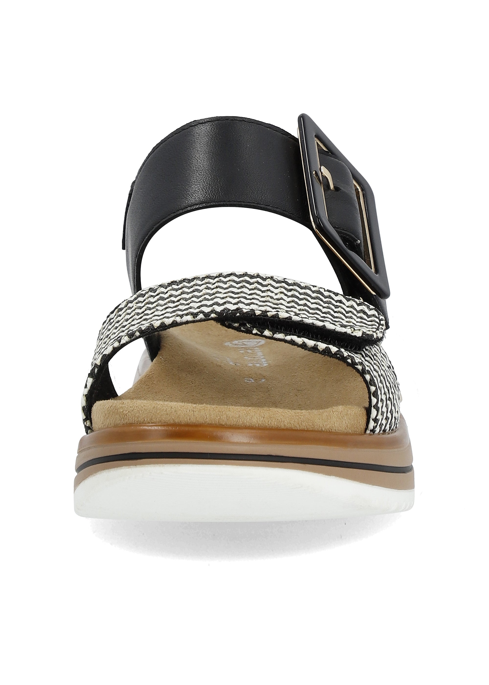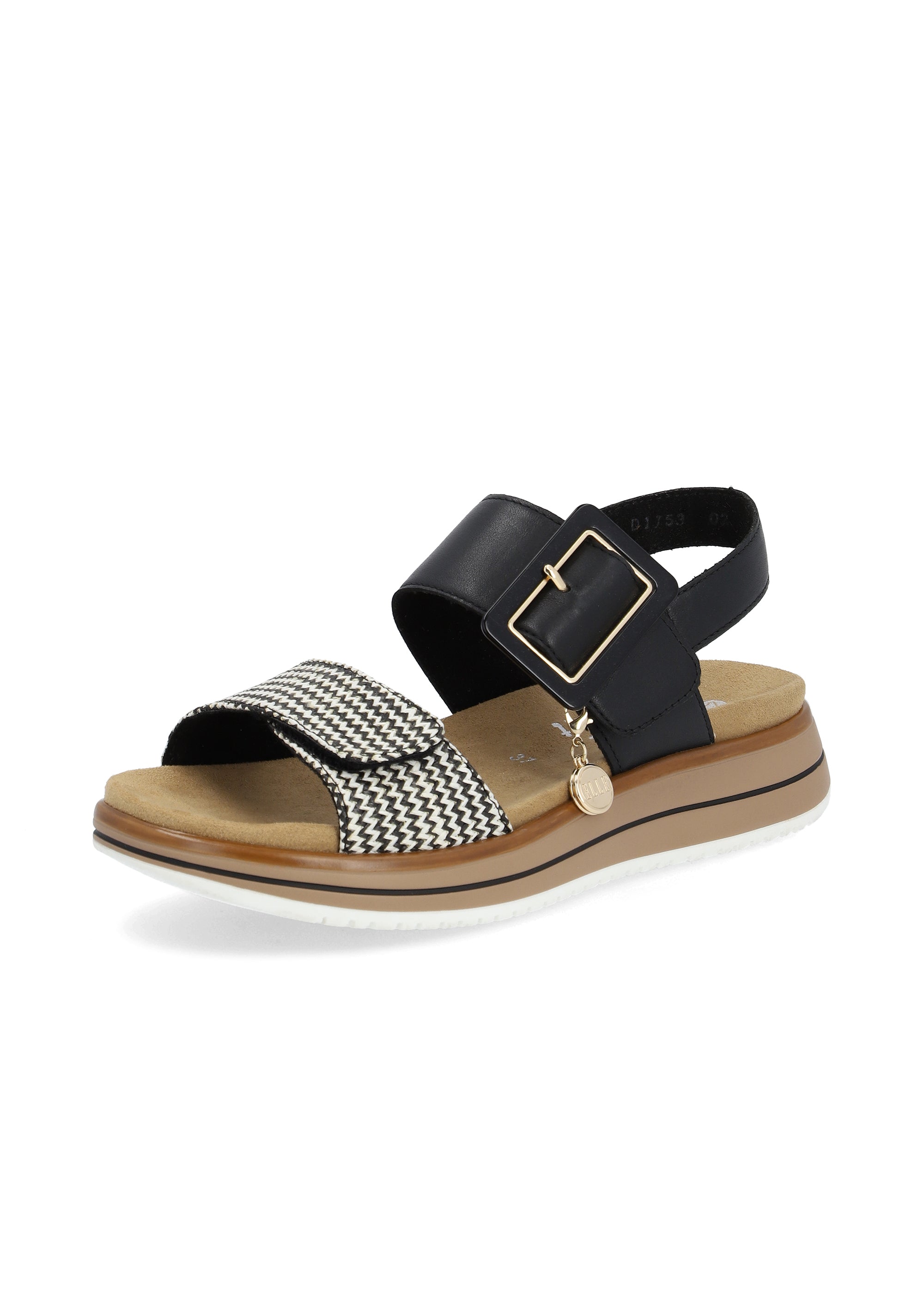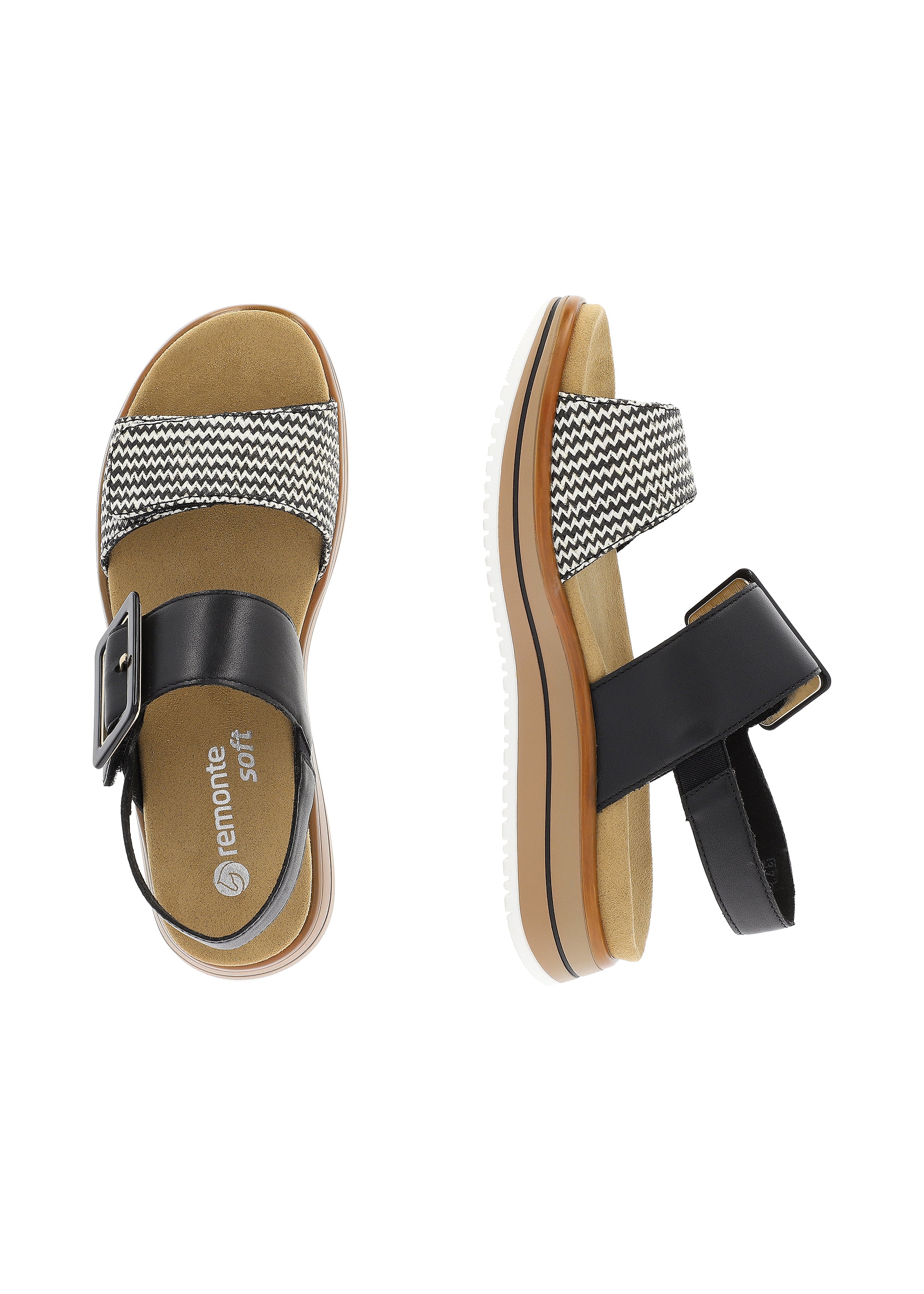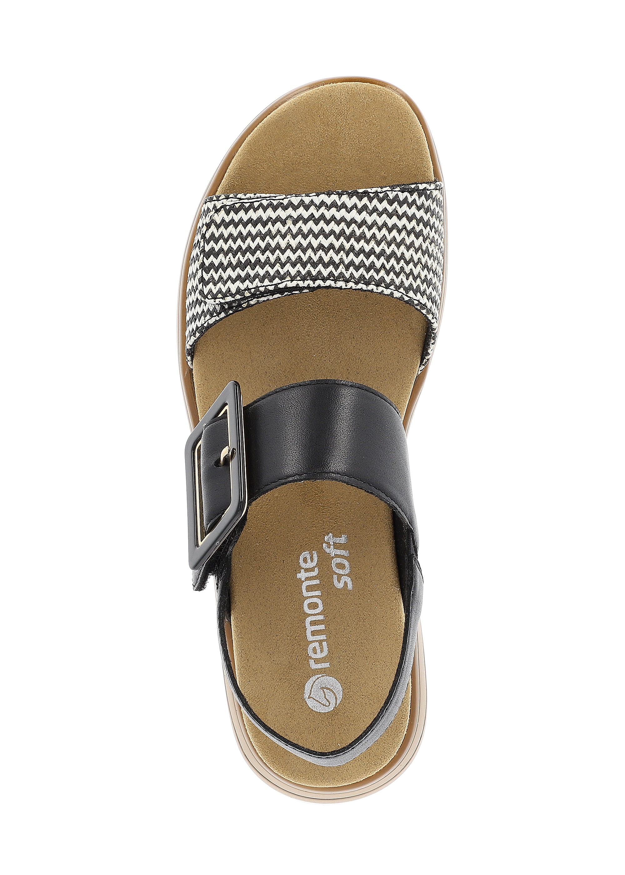 Hienot sandaalit Remontelta! Tyylikäs tumma look mustan,valkomustan kuvion ja ruskean sävyjen vuorotellessa. Kaunis solki kruunaa tyylin! Remonte Lite 'n Soft -kengät ovat nimensä mukaisesti pehmeät ja kevyet paksusta pohjasta huolimatta, eli todella mukavat jalassa. Kuin tyynyillä kävelisi! Molemmissa remmeissä on leveä pitävä tarranauha, joten säätömahdollisuuksia on hyvin, lisäksi kannan takaa kiertävässä remmissä on sisäsivulla venyke. Leveät remmit pitävät kengät kivan tukevasti jalassa. Siistiä kesätyyliä!