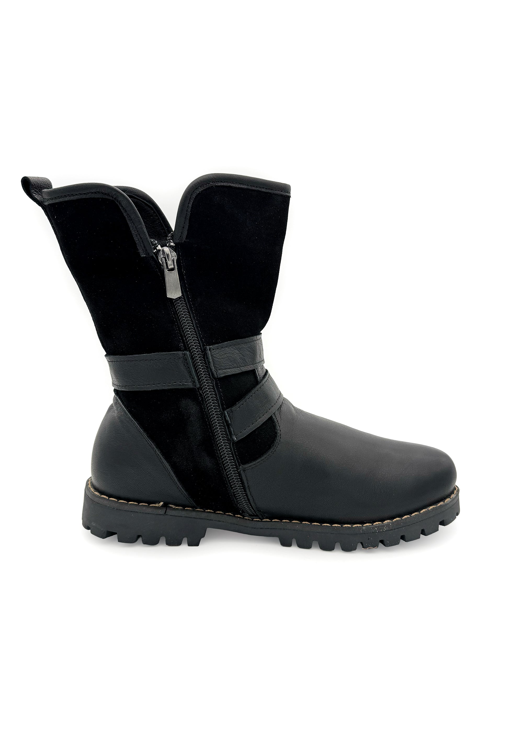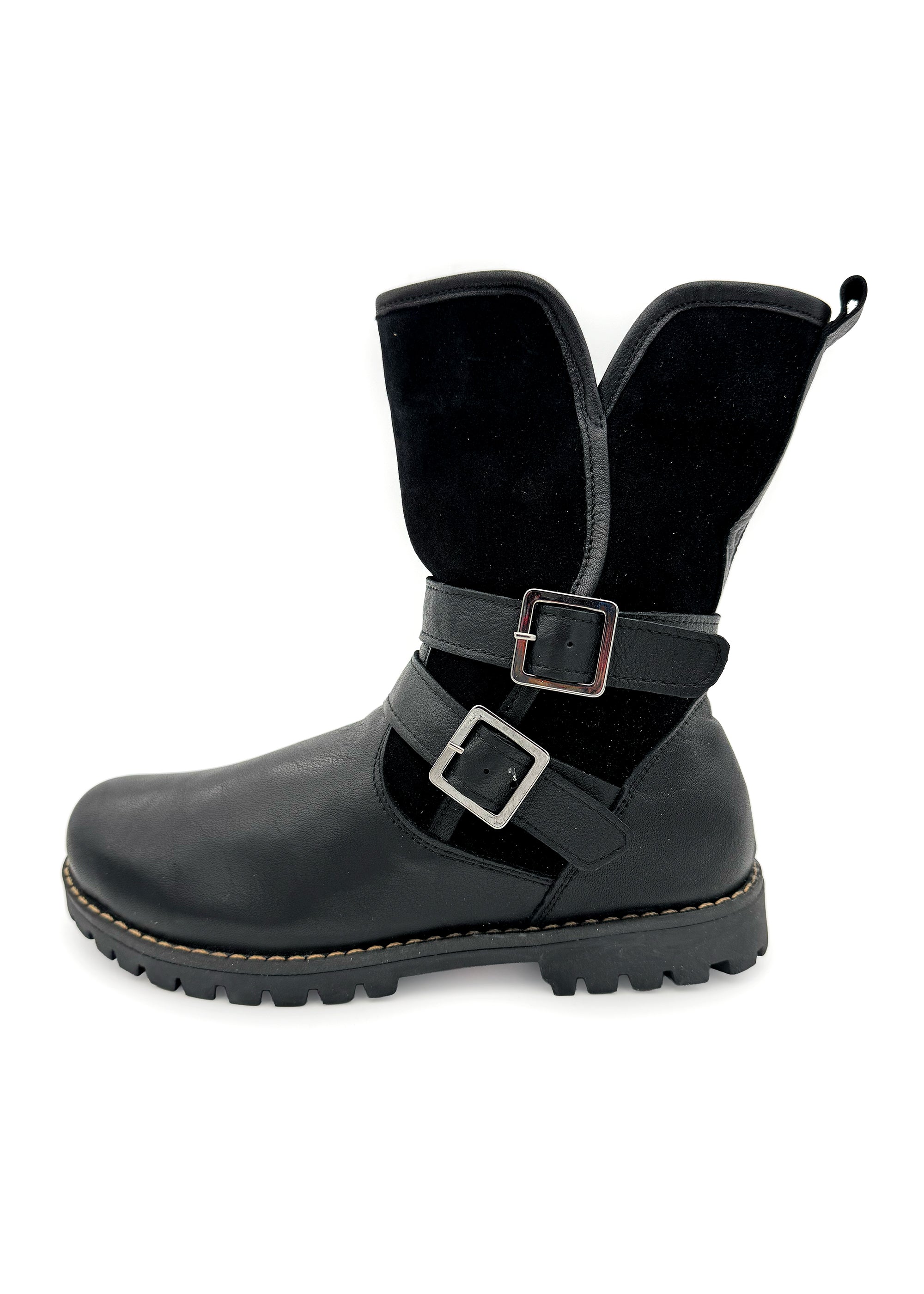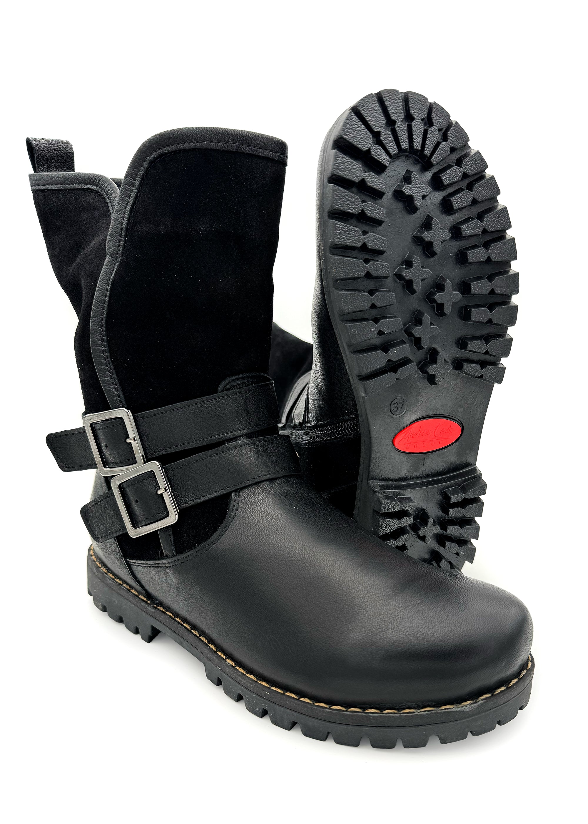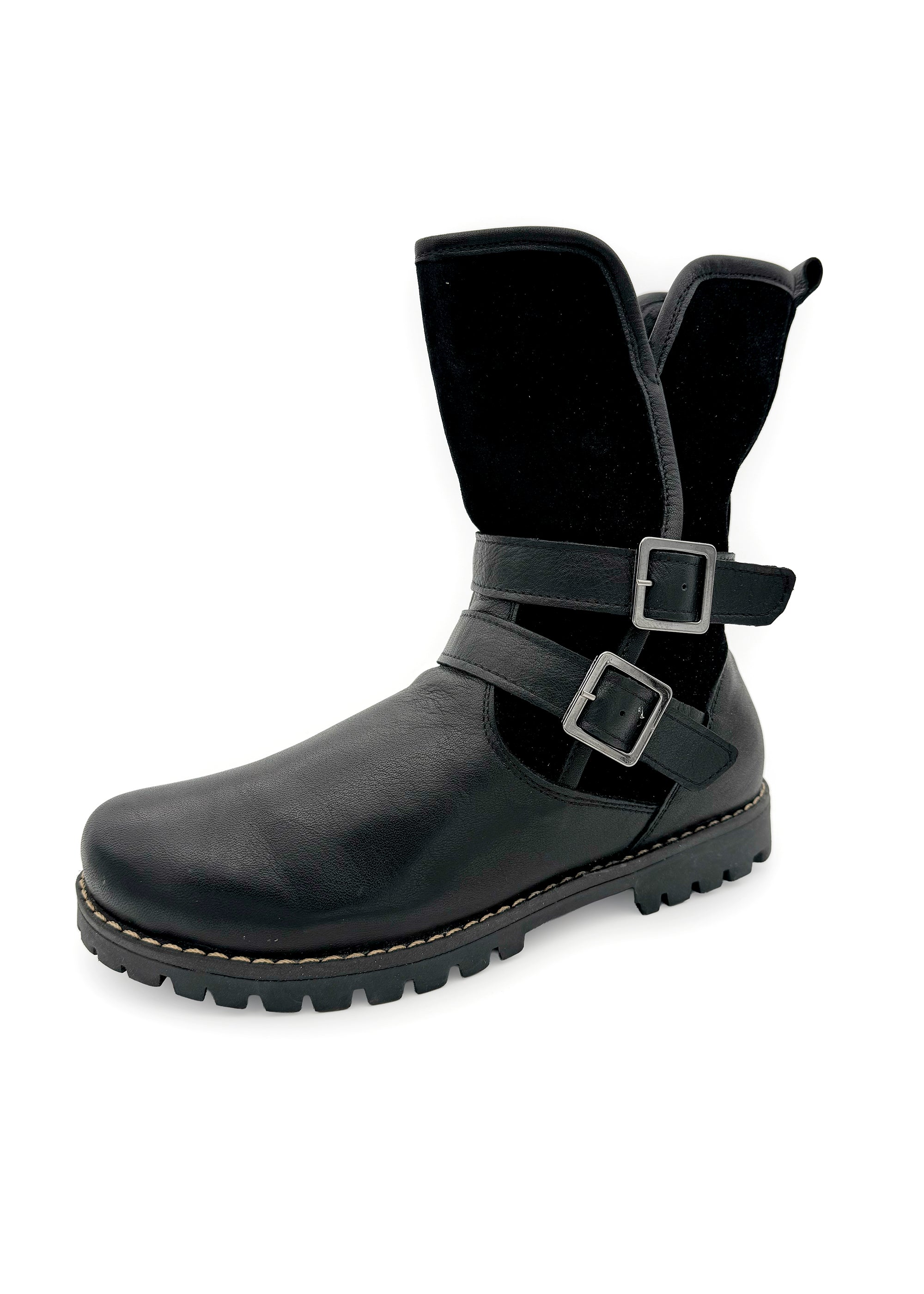 Mageet Andrea Contin nahkanilkkurit! Bootsihenkiset mustat talvikengät ovat todella pehmeää nahkaa ja mukavat jalassa. Nilkan solkikoristeet ovat niin hyvännäköiset! Kengät ovat myös lämpimät, sisältä löytyy paksu karvavuori, ulkopuolella on yhdistetty mokka- ja pintanahkaa. Sisäsivuilla on vetoketjut pukemista varten. Nilkkureissa on myös leveä lesti, lisäksi nahka muokkaantuu mukavasti. Aivan ihanat talvikengät moneen menoon!