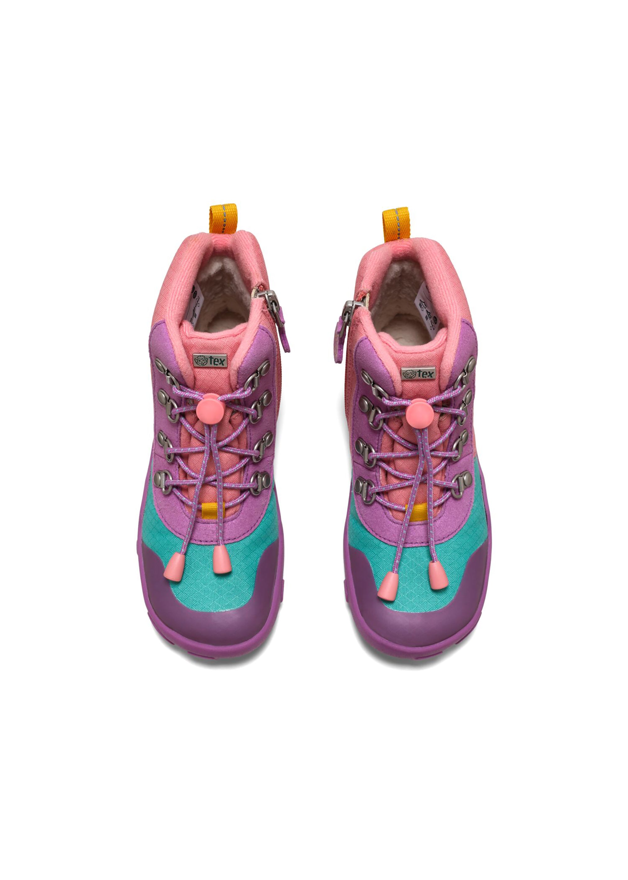 Children's barefoot shoes - Mid Boot Vegan Discovy, winter shoes with TEX membrane - Owl, pink-purple-turquoise