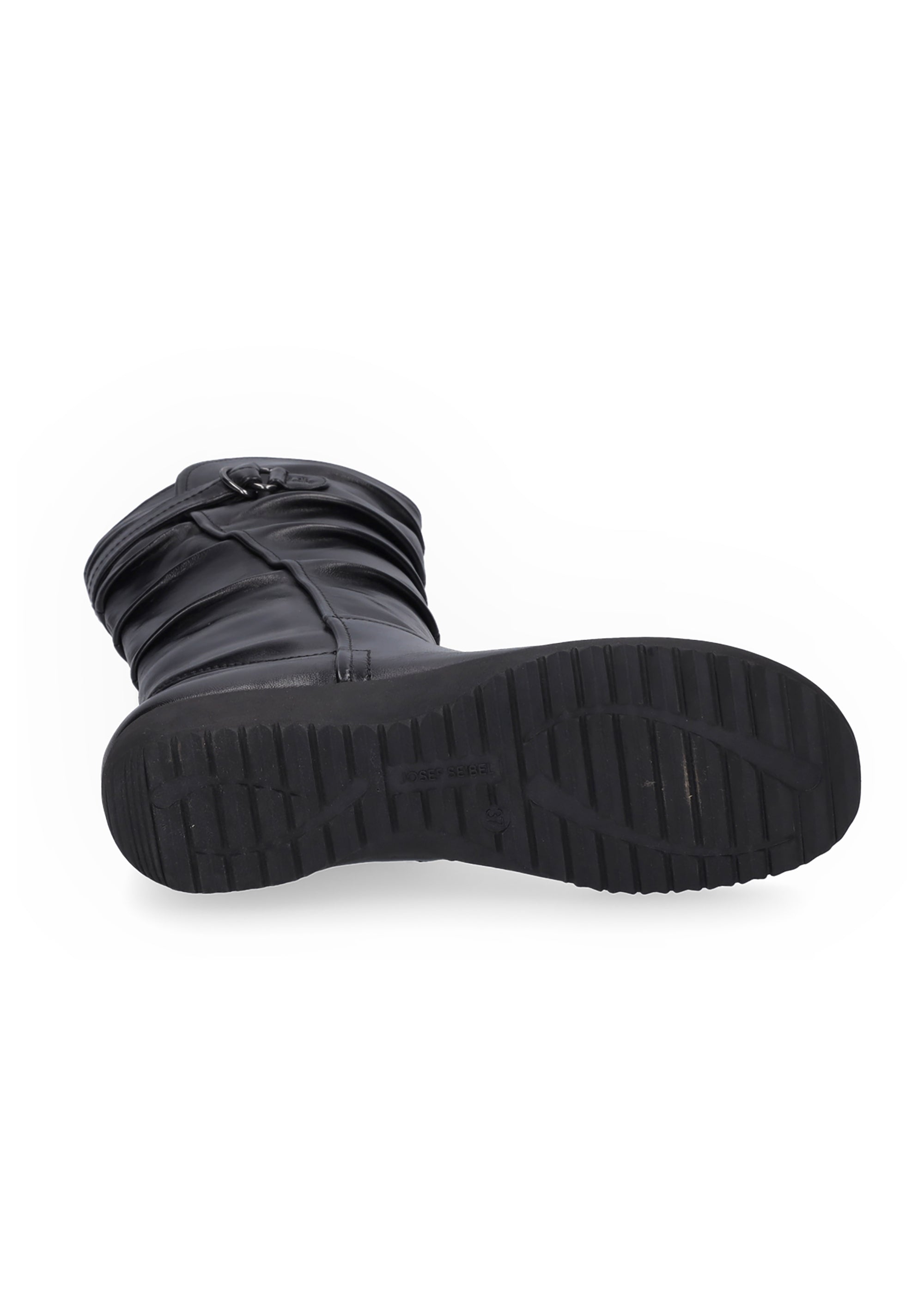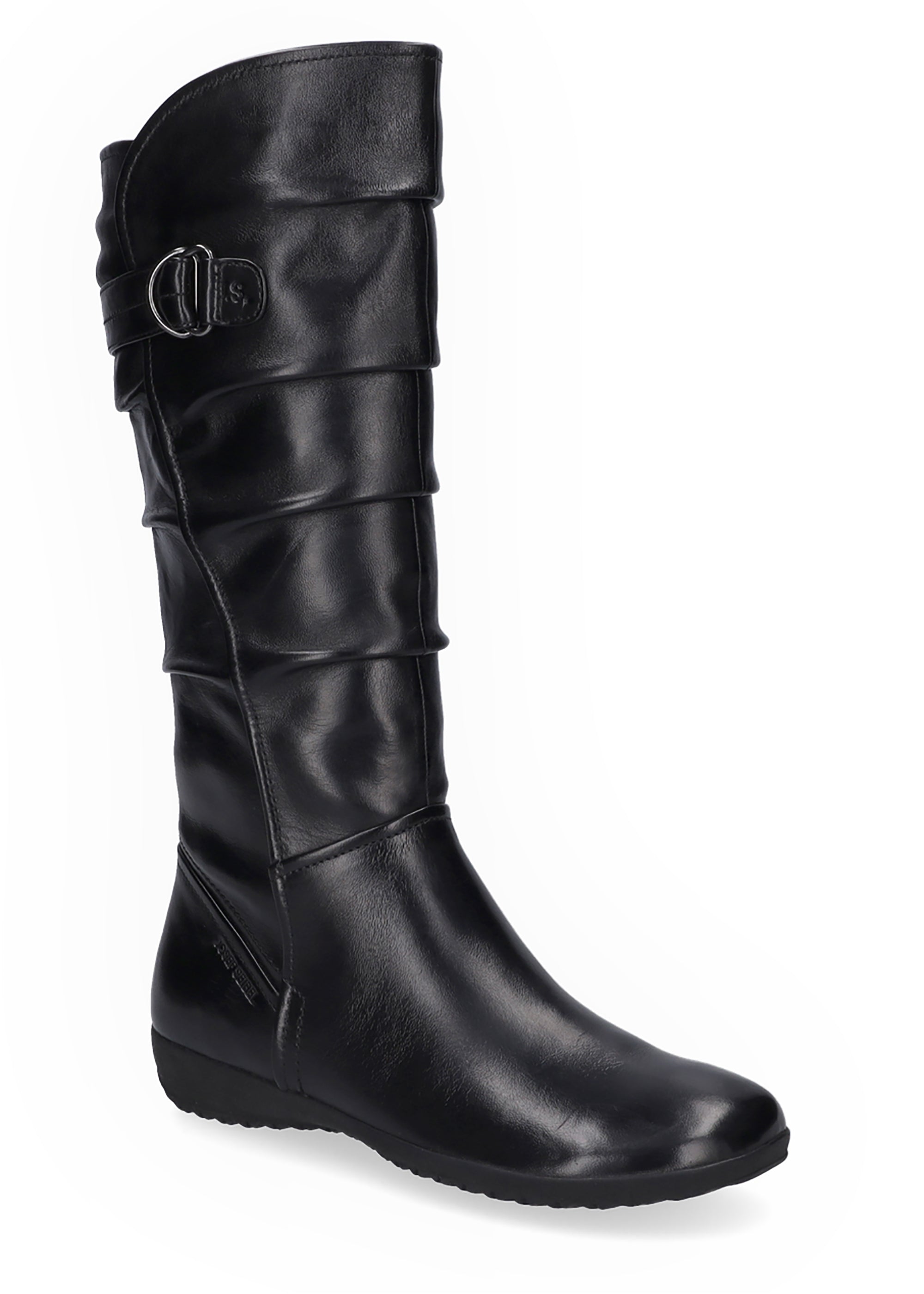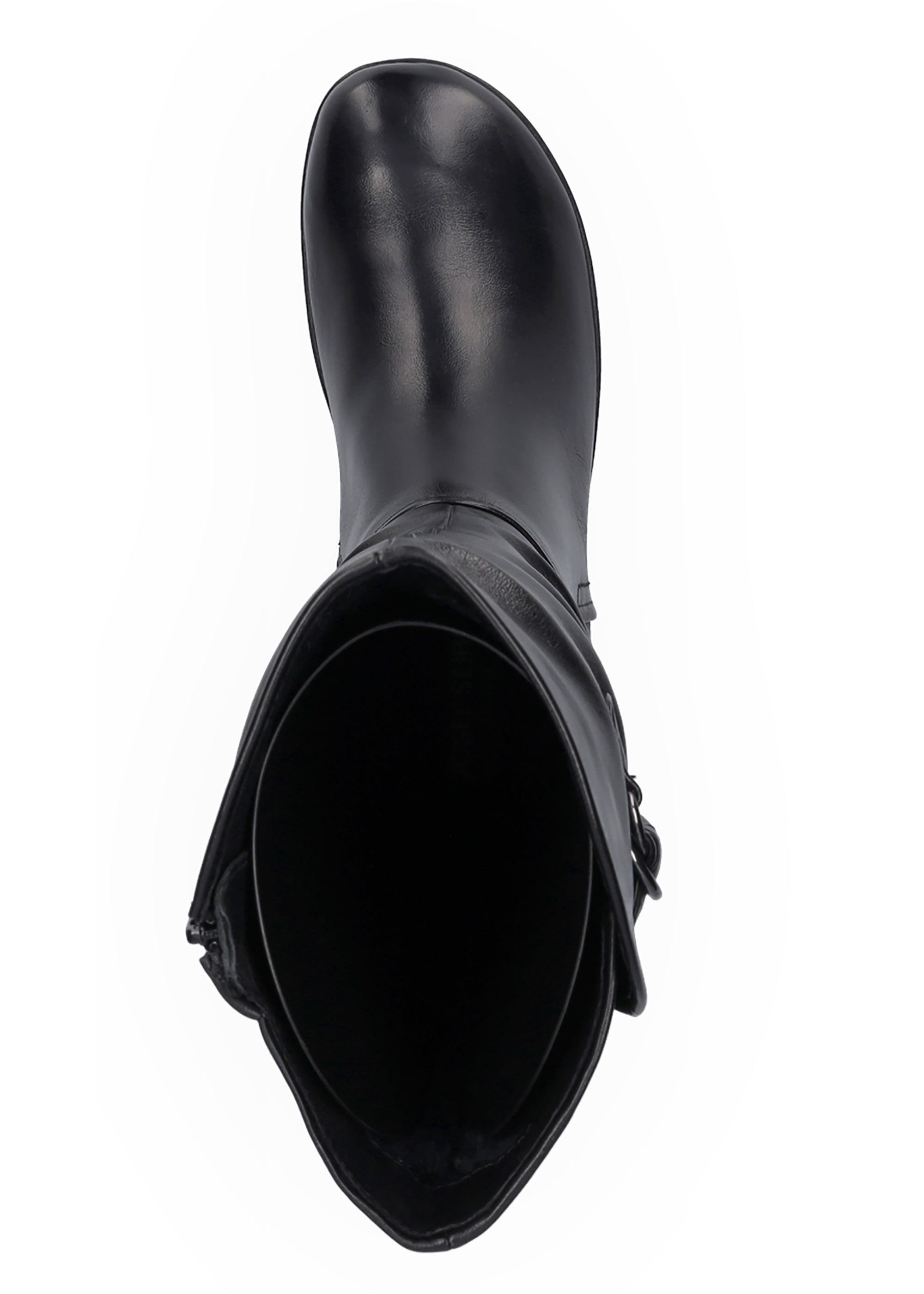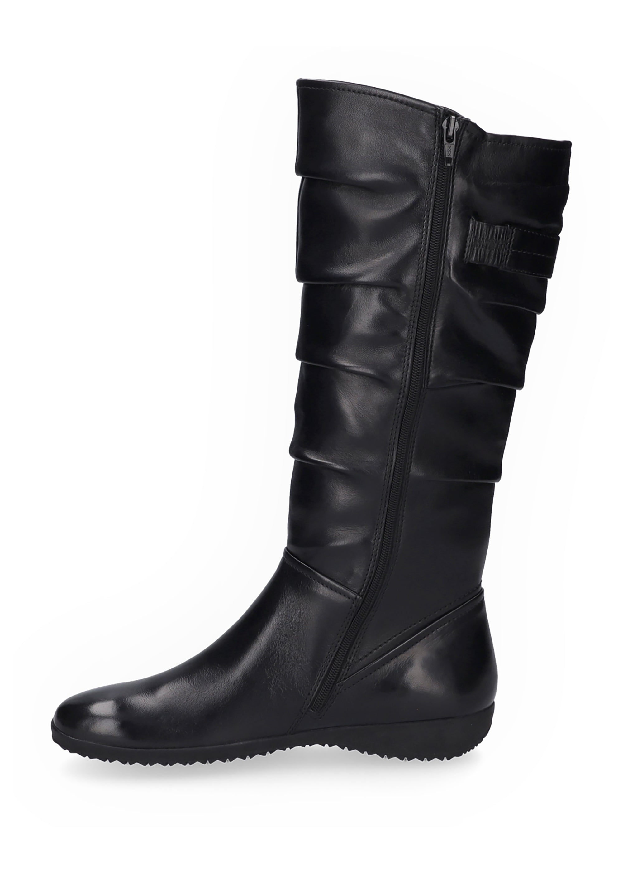 Nice black Josef Seibel boots! Completely black boots or high-ankle booties, however you want to describe these beauties. The shaft is attractively wrinkled, with a decorative strap at the top of the shaft. On the inner side of the strap is an elastic insert to improve fit, and there are zippers on the inner sides for putting them on. The last is nicely medium-wide, with plenty of room for the toes. Thanks to the thin fleece lining, the shoes are warm even in light frost. Lovely shoes for many outfits and occasions!