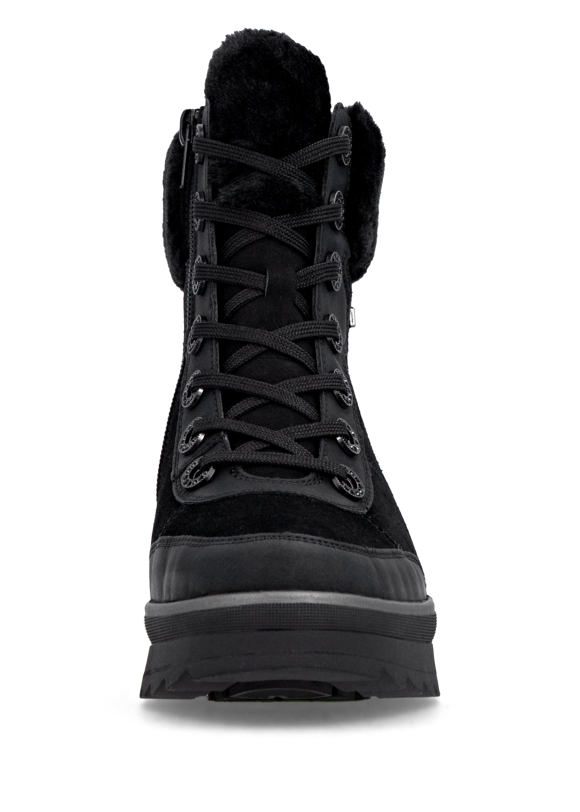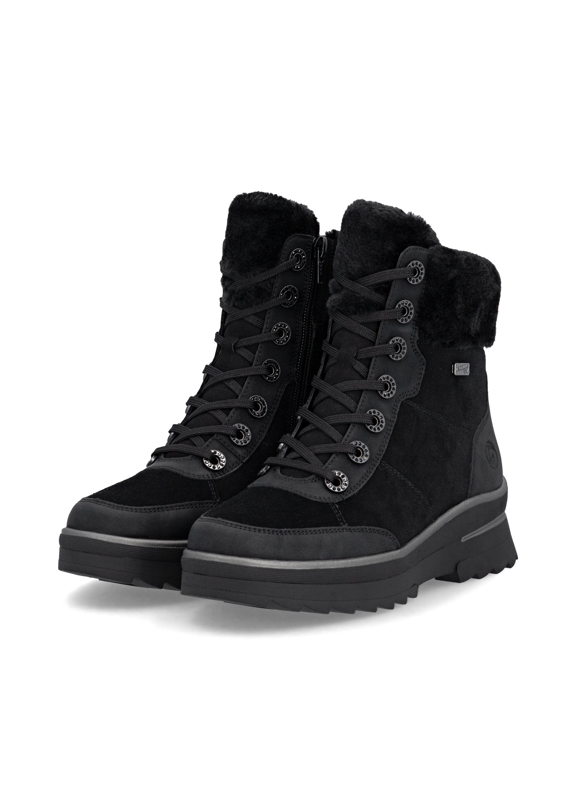 Cute winter shoes from Remonte! A warm sheepswool lining ensures that feet stay comfortably warm in these shoes, and the Remonte-TEX membrane keeps toes dry. The ankle boots have removable Remonte Soft foam insoles that make the shoes feel wonderfully soft and comfortable on the feet. The insoles are also Remonte Thermo insoles, suitable thermal insoles for winter. The upper material alternates between suede and smooth leather, with diamond-decorated lace eyelets adding a touch of bling to the style. Not to mention the lovely furry upper part! The fit of the shaft and instep can be well adjusted with laces, and once the lace settings are done, there are zippers on the inner sides for easy wearing. Warm style for winter!