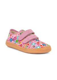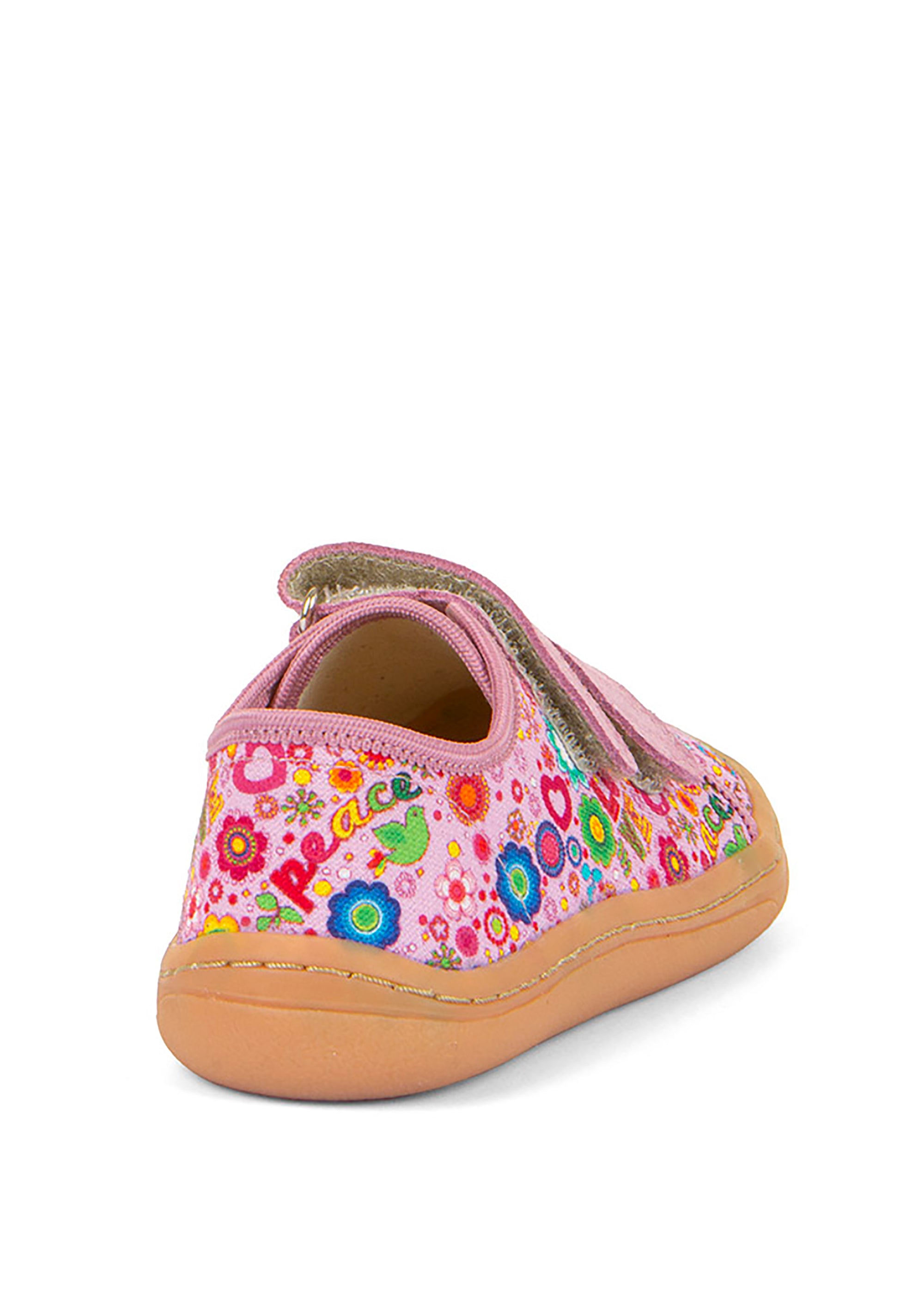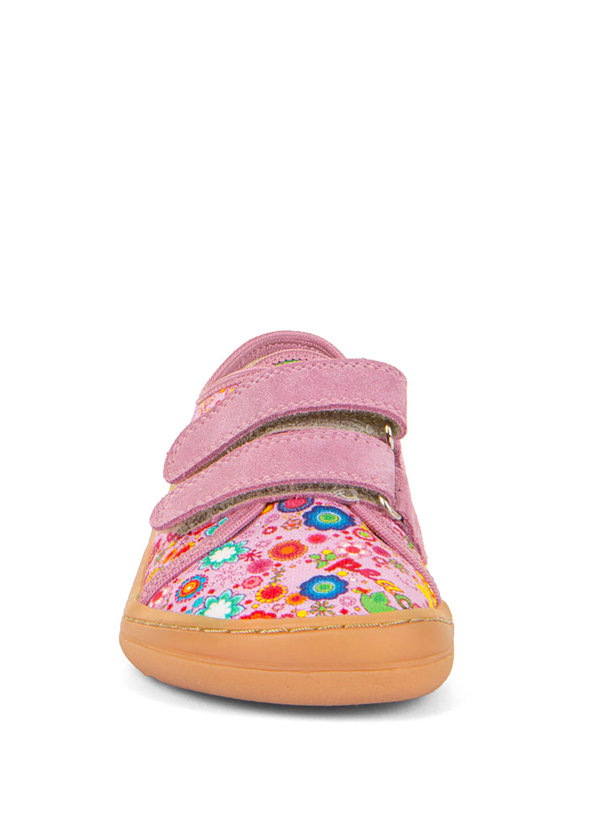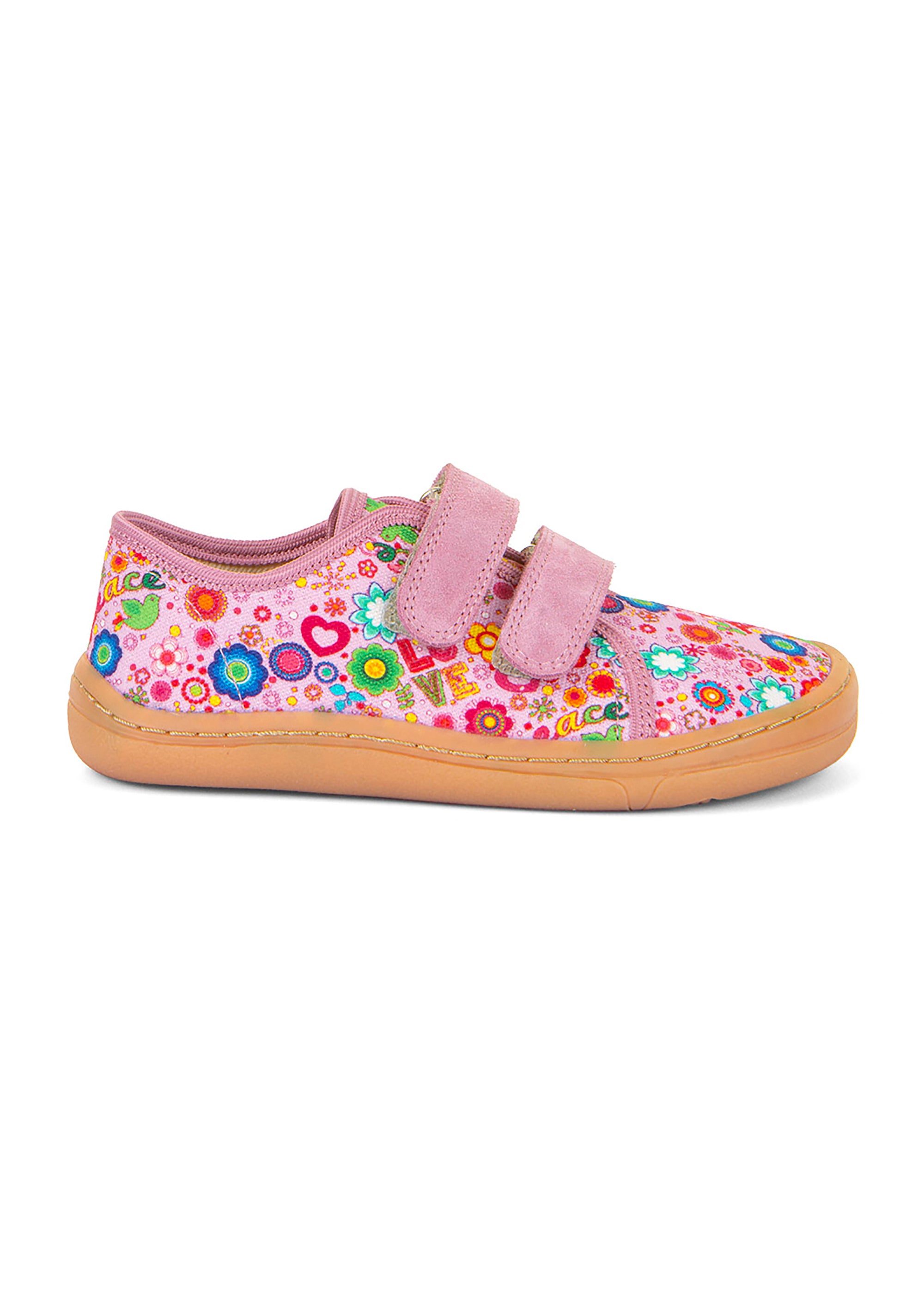 Suloiset lasten paljasjalkatennarit Froddolta – vaaleanpunaiset ihanuudet täynnä sydämiä ja kukkia. Täydellinen valinta pikkuisille, jotka rakastavat hempeitä värejä ja iloisia kuvioita!