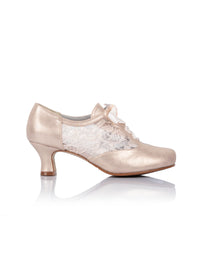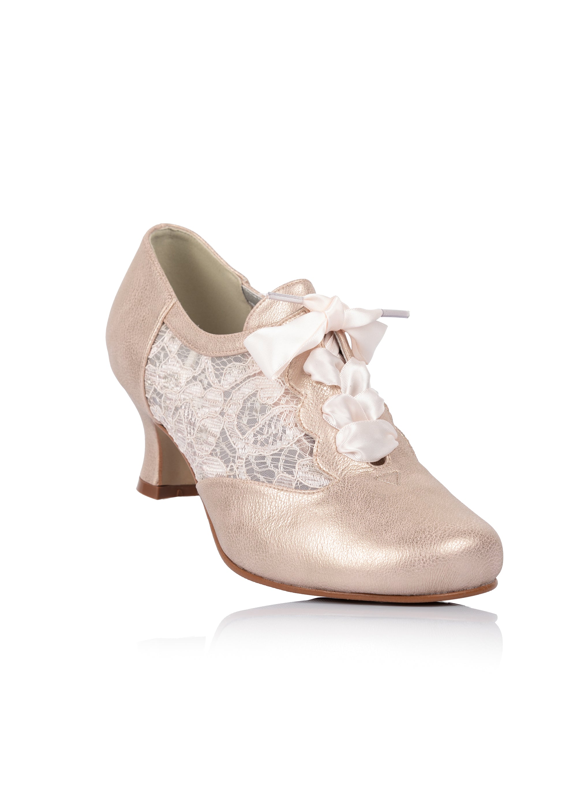 Juhlavat kävelykengät - puuterinsävy, pitsiä sivuilla, laaja lesti