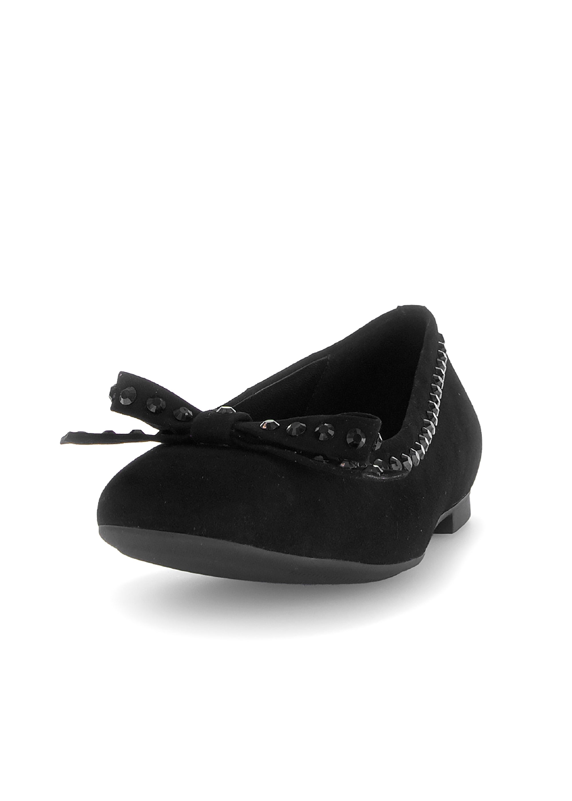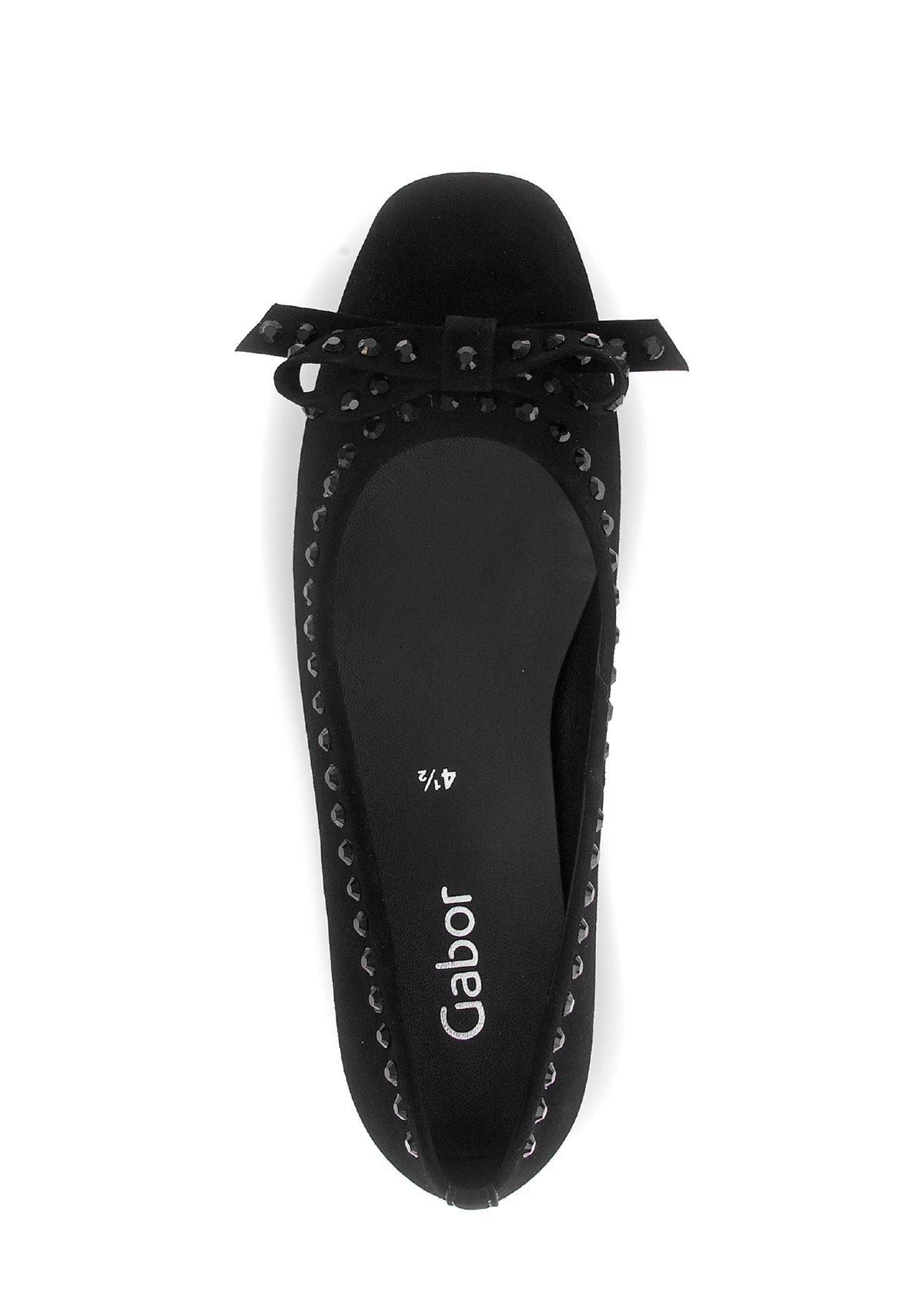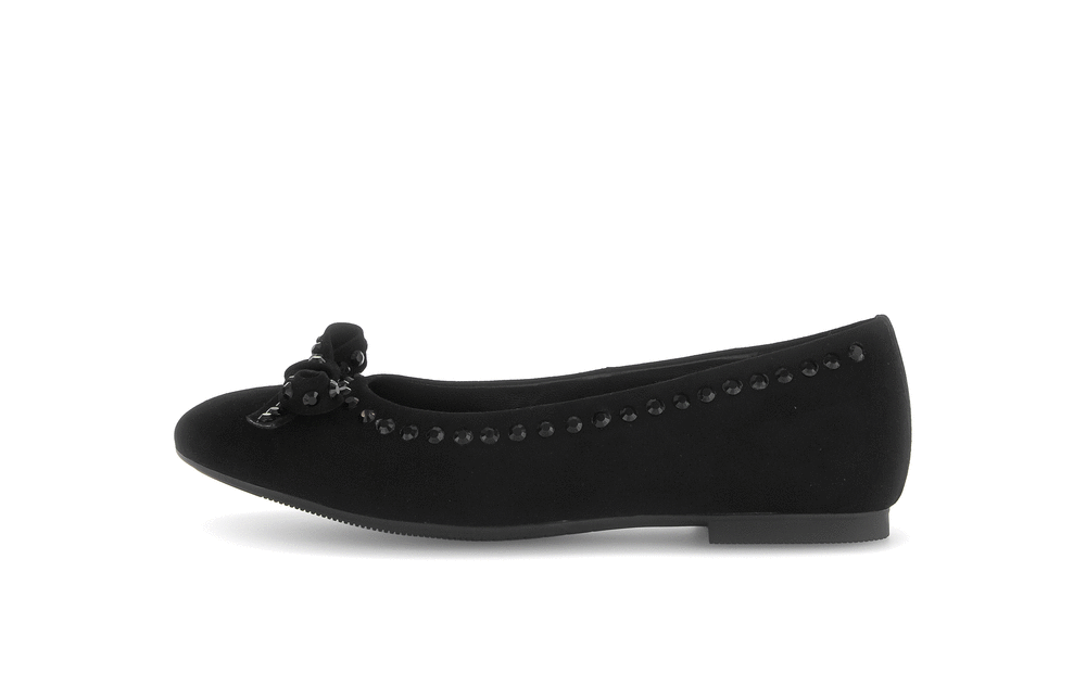 Upeat ballerinat Gaborilta! Siro malli, tyylikkäällä mustalla nupukkinahalla. Avokkaat on koristeltu rusetilla ja tummilla niiteillä, ripaus särmää tyyliin! Kärki ei ole terävimmästä päästä, vaan pehmeän pyöreästi vähän kulmikas. Näin varpaatkin saavat mukavammin tilaa kärjessä. Ihastuttavat ballerinat arkeen ja juhlaan!