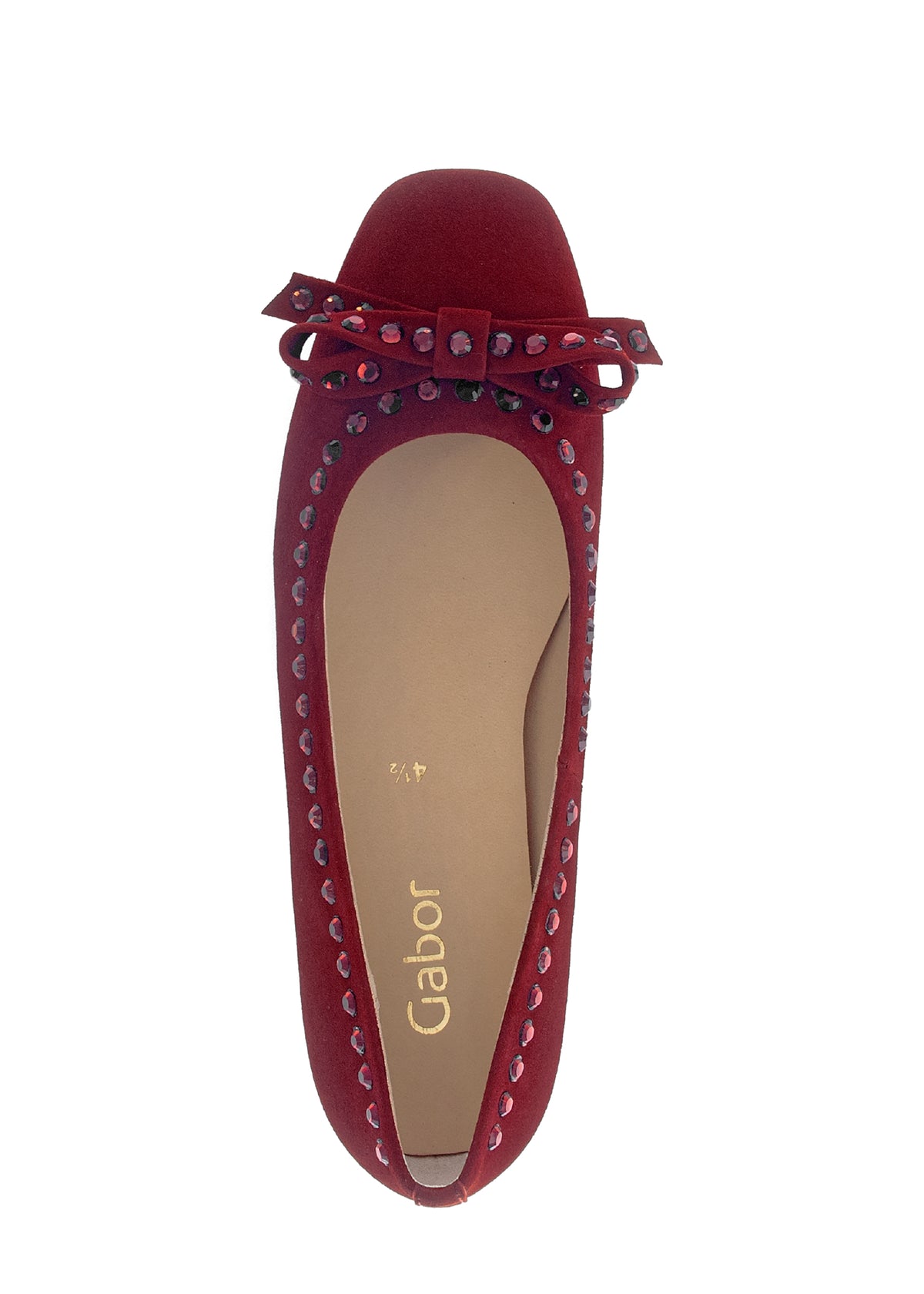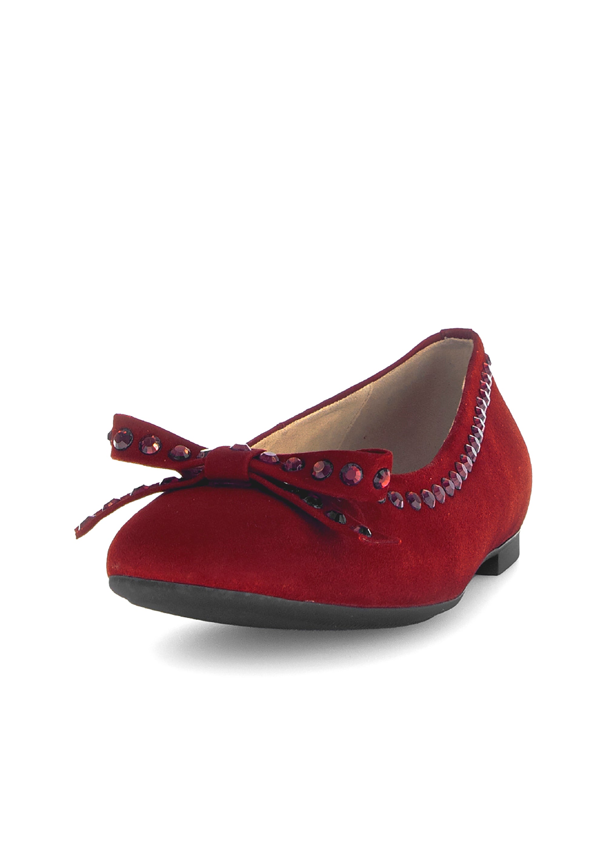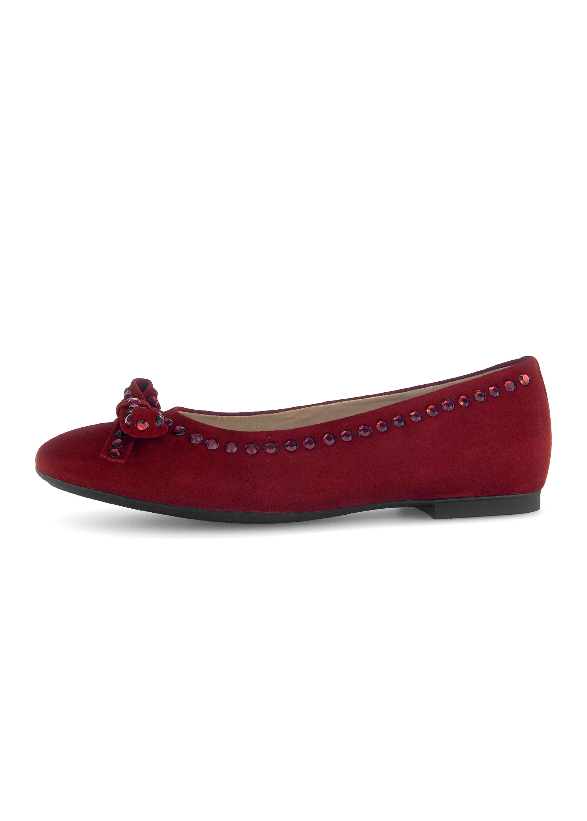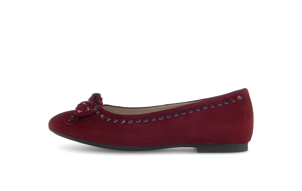 Kauniit ballerinat Gaborilta! Siro malli, hienolla viininpunaisella nupukkinahalla. Avokkaat on koristeltu rusetilla ja tummanpunaisilla niiteillä, ripaus särmää tyyliin! Kärki ei ole terävimmästä päästä, vaan pehmeän pyöreästi vähän kulmikas. Näin varpaatkin saavat mukavammin tilaa kärjessä. Ihastuttavat ballerinat arkeen ja juhlaan!