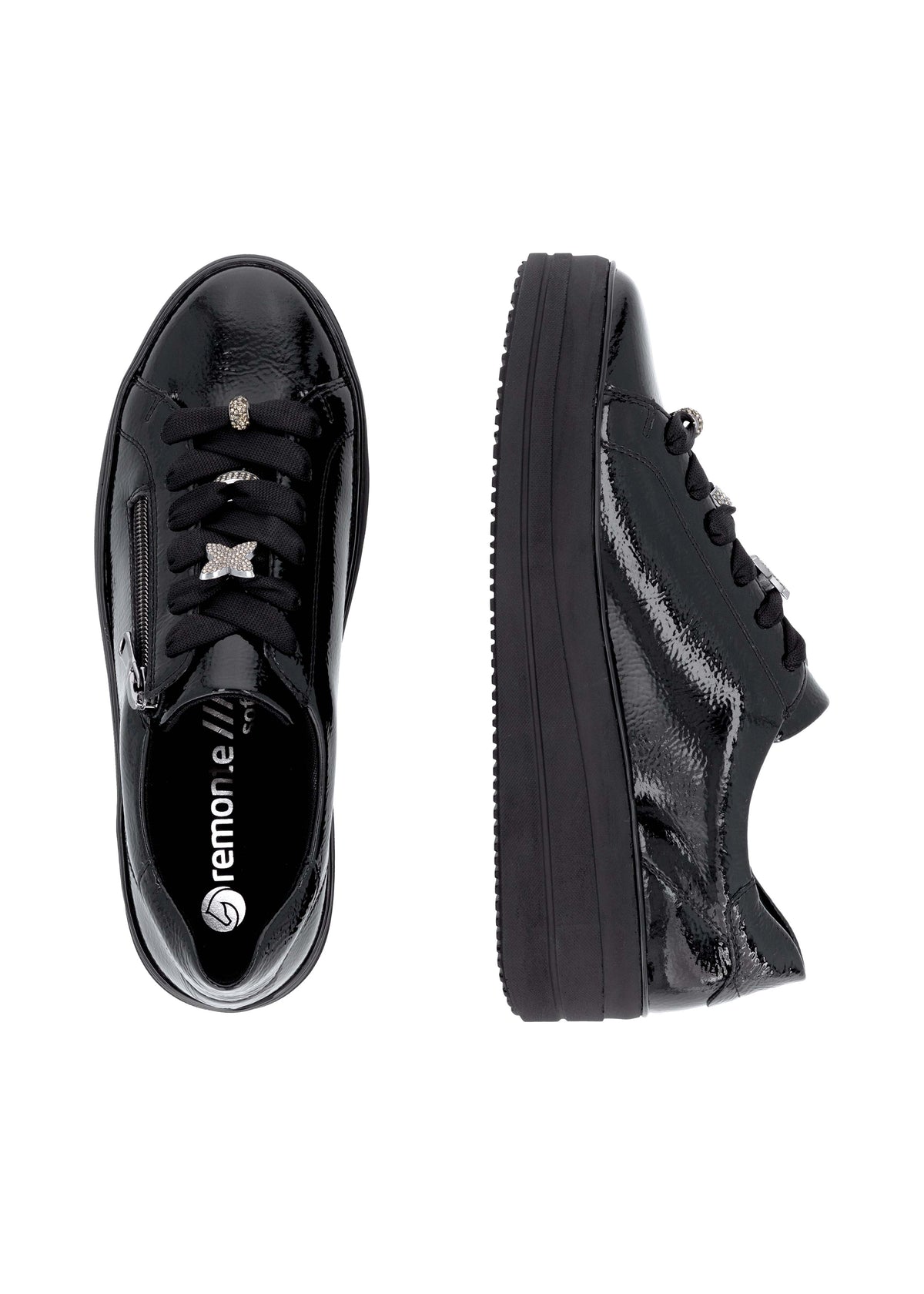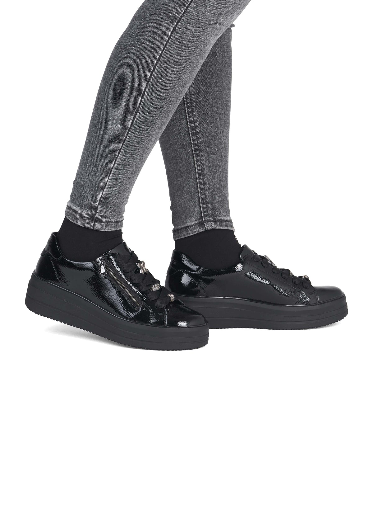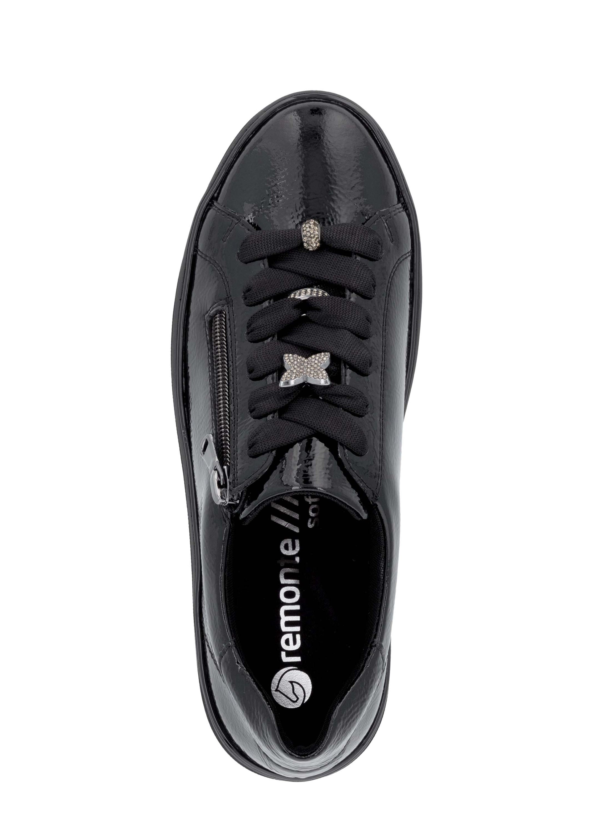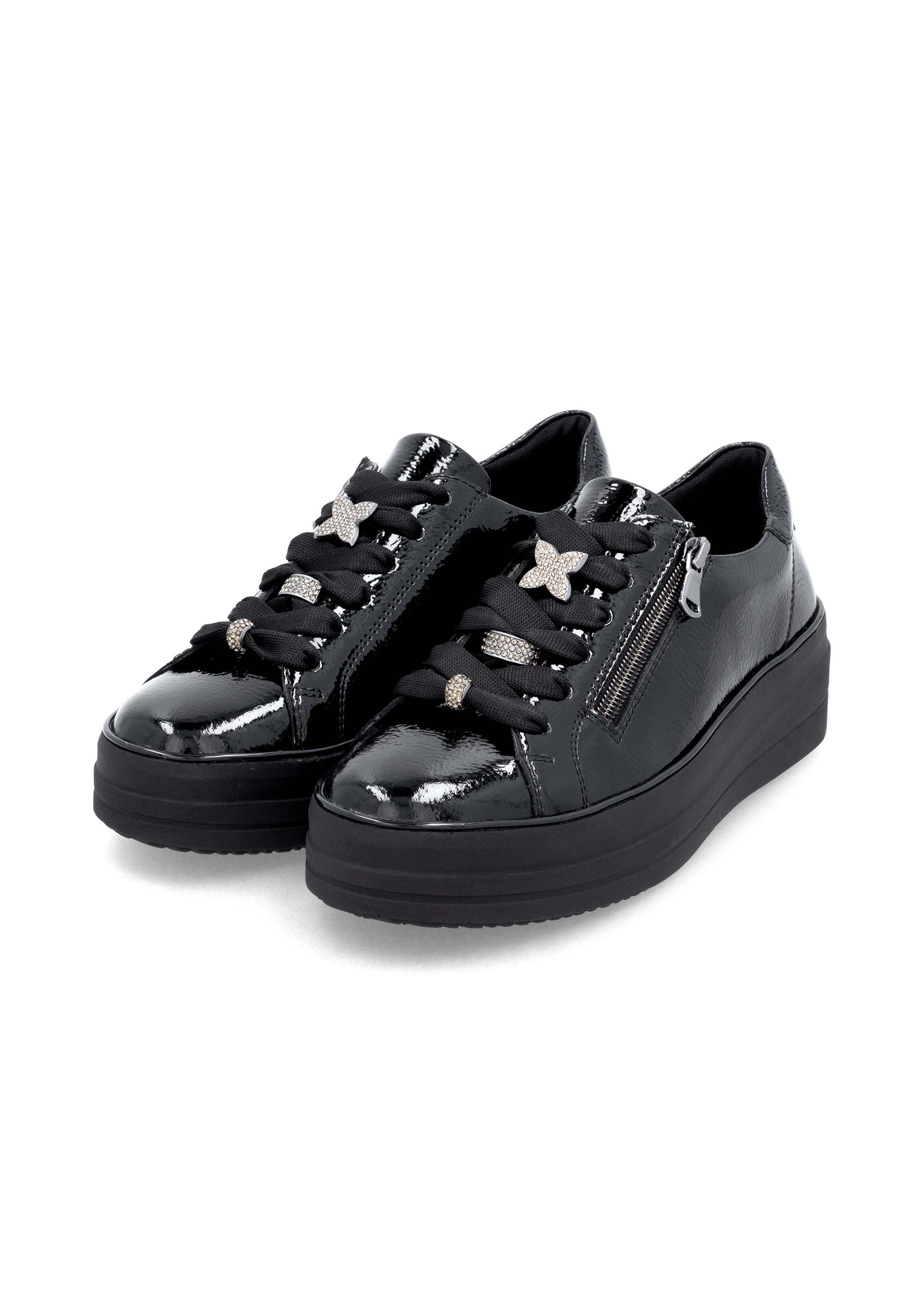 Hienot tennarit Remontelta! Tyylikkäät kiiltävät mustat kävelykengät paksummalla pohjalla. Täysmusta look, musta kiiltonahka ja paksu musta mattapintainen pohja näyttävät hyvältä yhdessä. Myös hopeanväriset timanttikoristeet nauhoissa tuovat kivasti blingiä ilmeeseen! Kengät ovat jalassa kivan pehmeät, ovathan ne Remonte Lite 'n Soft -mallistoa. Nauhoilla saa istuvuutta säädettyä hyvin, kengissä on myös pukemista helpottavat vetoketjut nauhojen vieressä. Hienot kengät moniin menoihin ja kävelyihin!