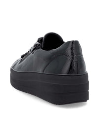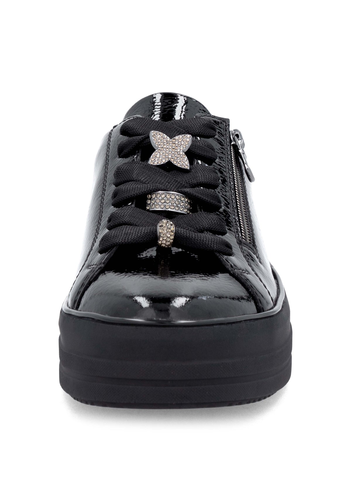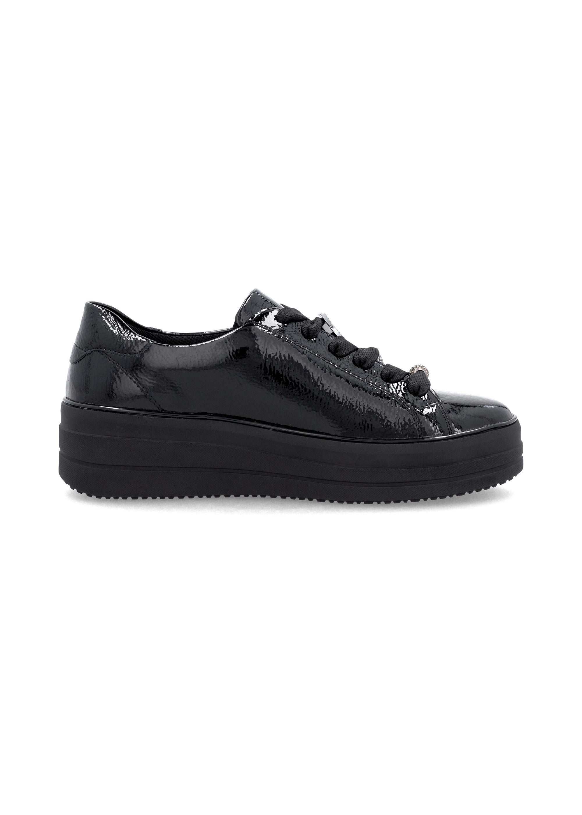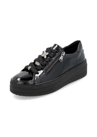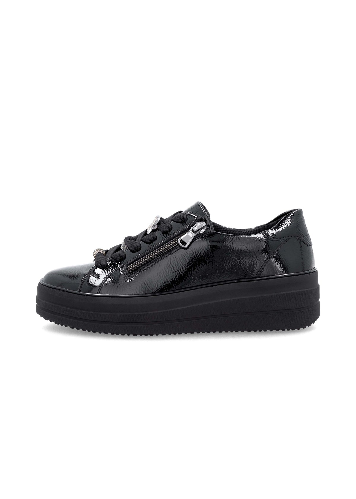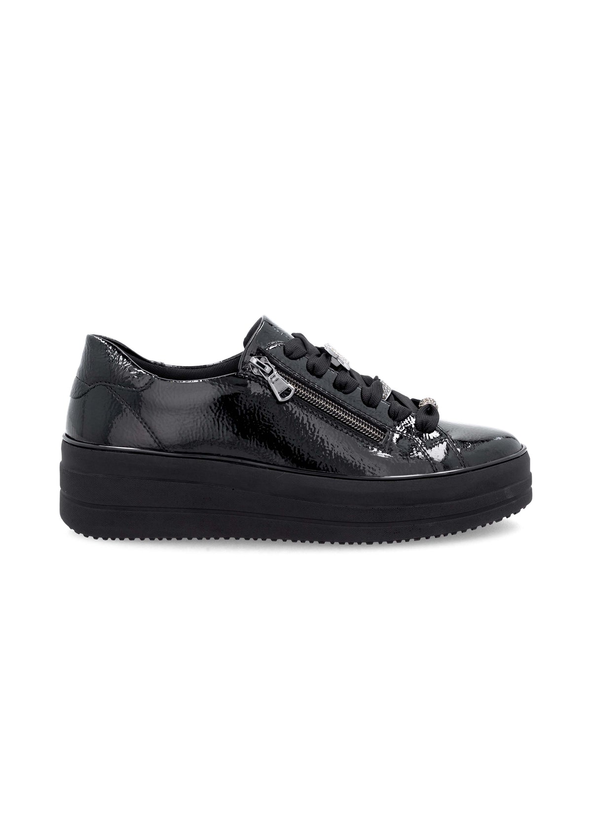 Hienot tennarit Remontelta! Tyylikkäät kiiltävät mustat kävelykengät paksummalla pohjalla. Täysmusta look, musta kiiltonahka ja paksu musta mattapintainen pohja näyttävät hyvältä yhdessä. Myös hopeanväriset timanttikoristeet nauhoissa tuovat kivasti blingiä ilmeeseen! Kengät ovat jalassa kivan pehmeät, ovathan ne Remonte Lite 'n Soft -mallistoa. Nauhoilla saa istuvuutta säädettyä hyvin, kengissä on myös pukemista helpottavat vetoketjut nauhojen vieressä. Hienot kengät moniin menoihin ja kävelyihin!