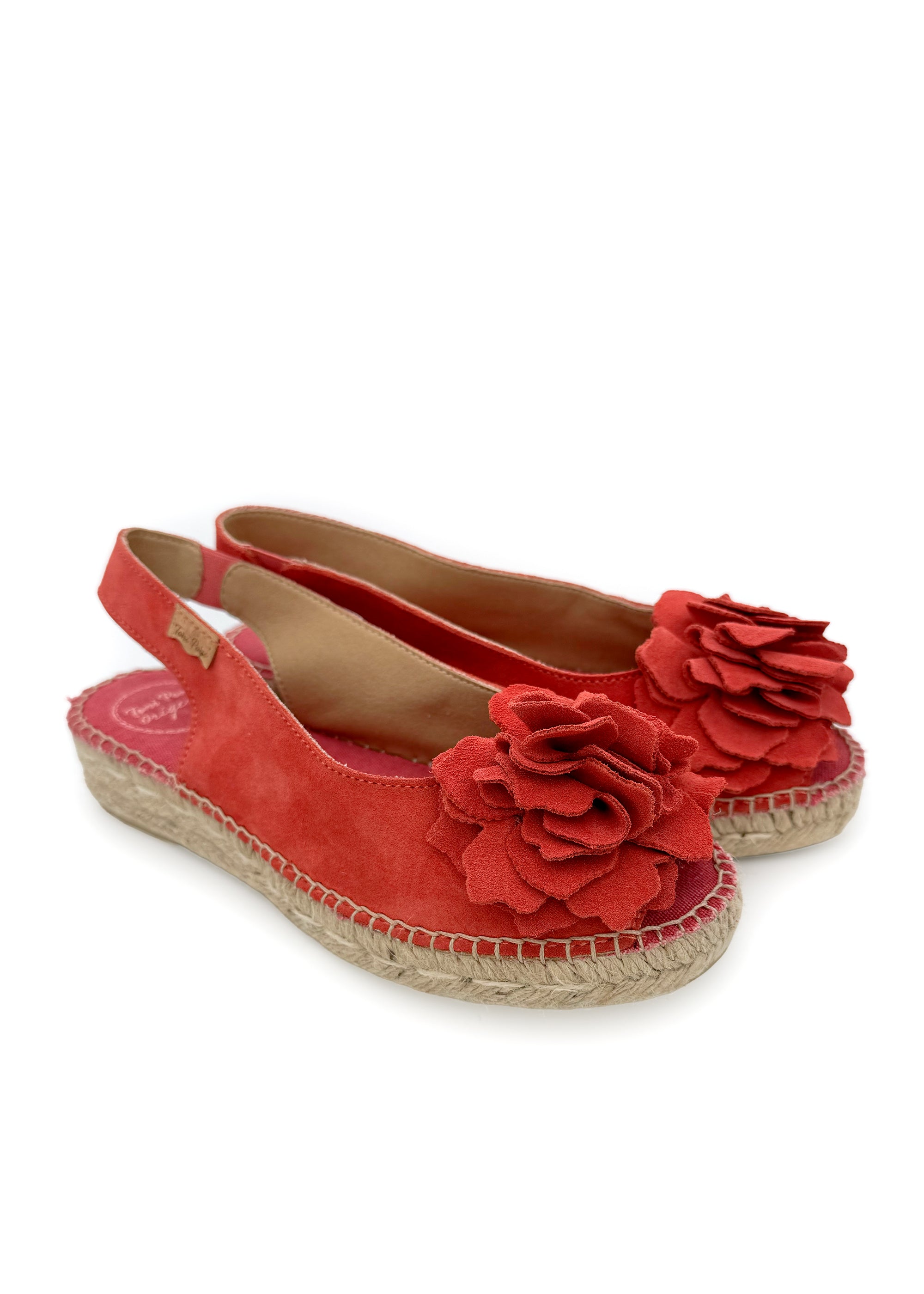 Söpöt Toni Pons -espadrillot! Ihastuttavien Erica-espadrillojen juttu on varpaiden päällä oleva iso ruusukekoriste. Sandaalit ovat slingback-mallia, kannan takaa kiertävässä remmissä on sisäsivun puolella venyke pukemisen helpottamiseksi. Kärki on melkein suljettu, varpaat näkyvät vain pienestä aukosta kärjessä. Toni Ponsin kengät tehdään pitkälti käsityönä luonnonmateriaaleista Espanjassa. Ovat myös mukavan pehmeät jalassa. Pieni kiilakorkokin tuntuu hyvältä jalassa hyvän lestin ja päkiän alla olevan platformpohjan ansiosta. Kauniit kesäkengät moneen tilaisuuteen!