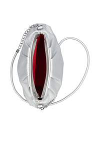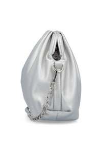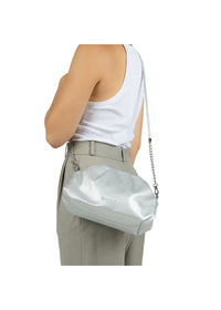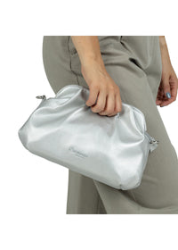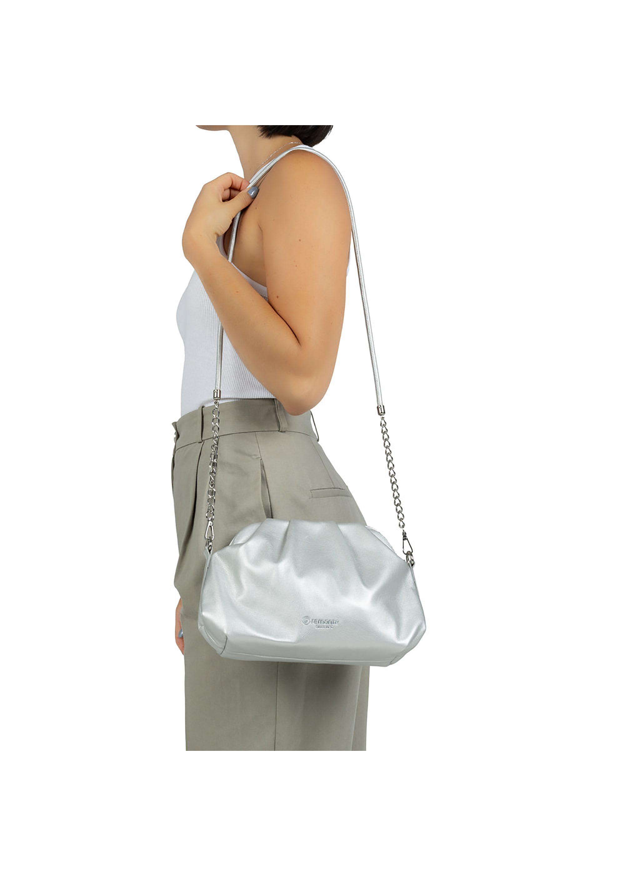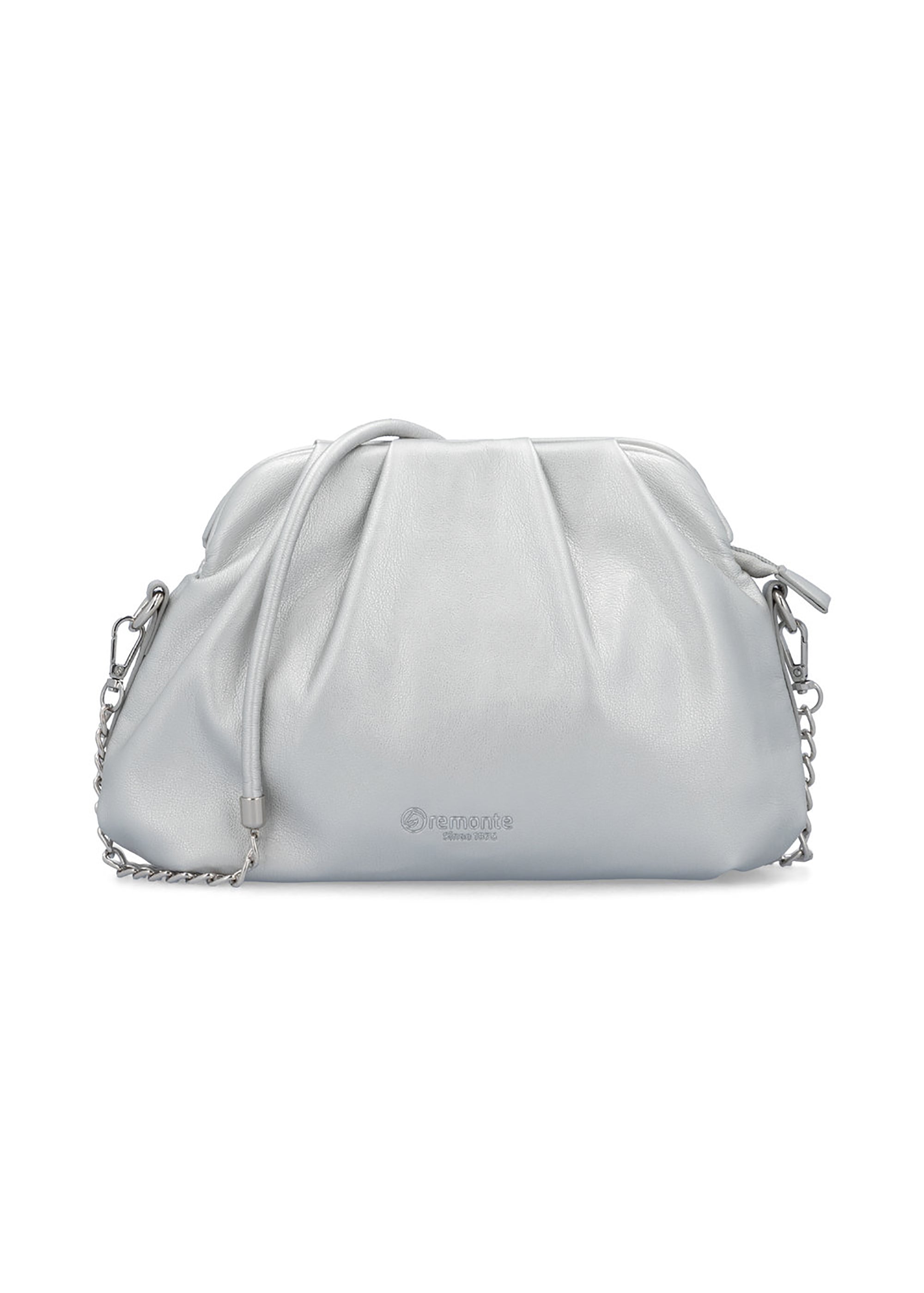 Kaunis hopeinen laukku Remontelta! Ihana himmeästi hopeanhohtoista materiaalia oleva pehmeä laukku. Kauniit rypytykset laukun yläosassa! Juhlalaukkua voi käyttää myös clutchina, olkahihna on irrotettava. Pikkulaukku on vetoketjulla suljettava, sisältä löytyy hauskasti punainen vuorikangas. Tyylikäs laukku arkeen ja juhlaan!