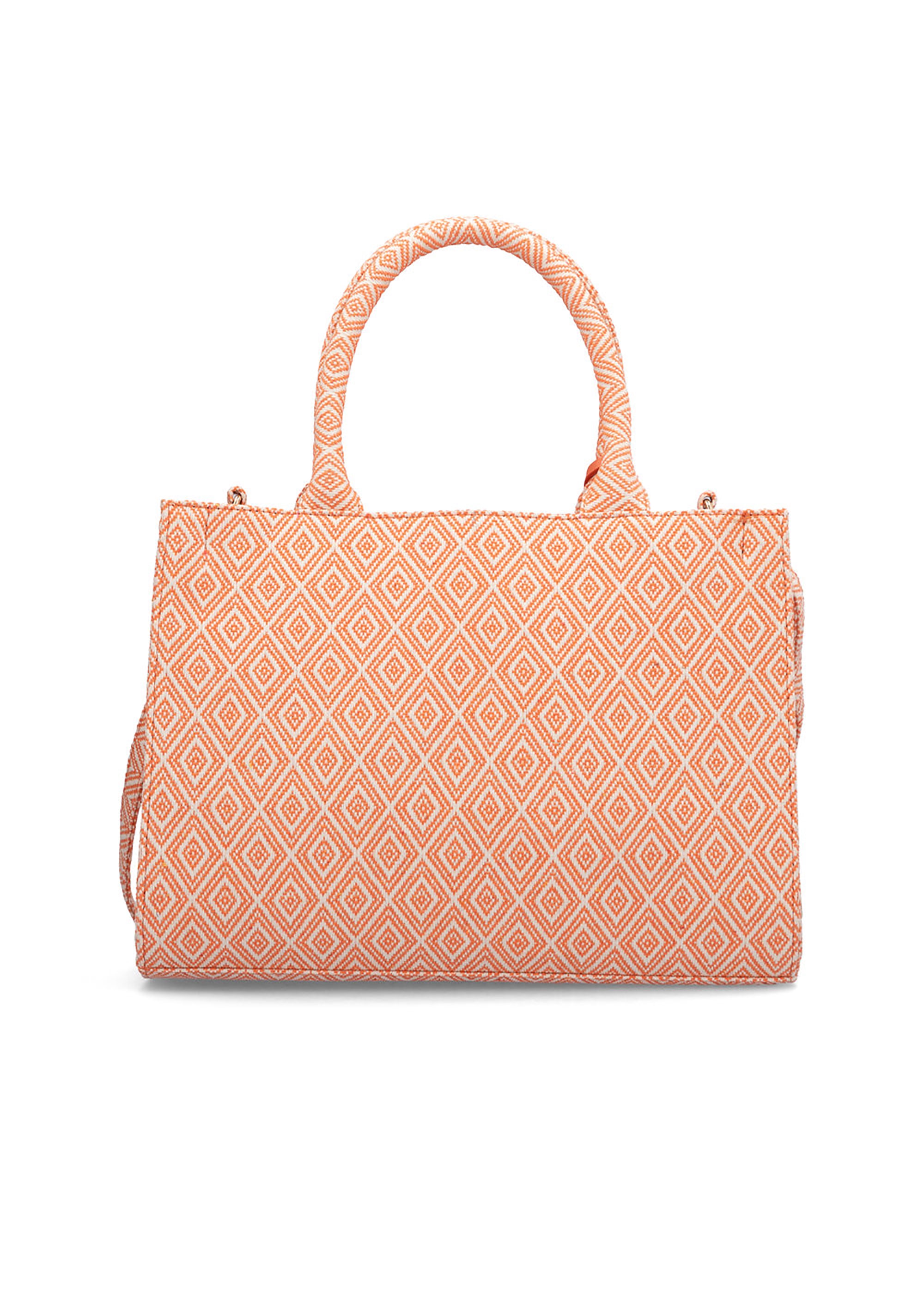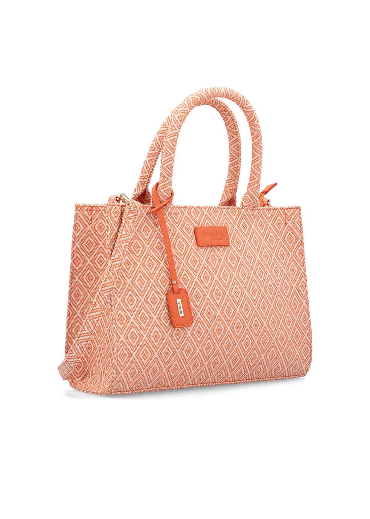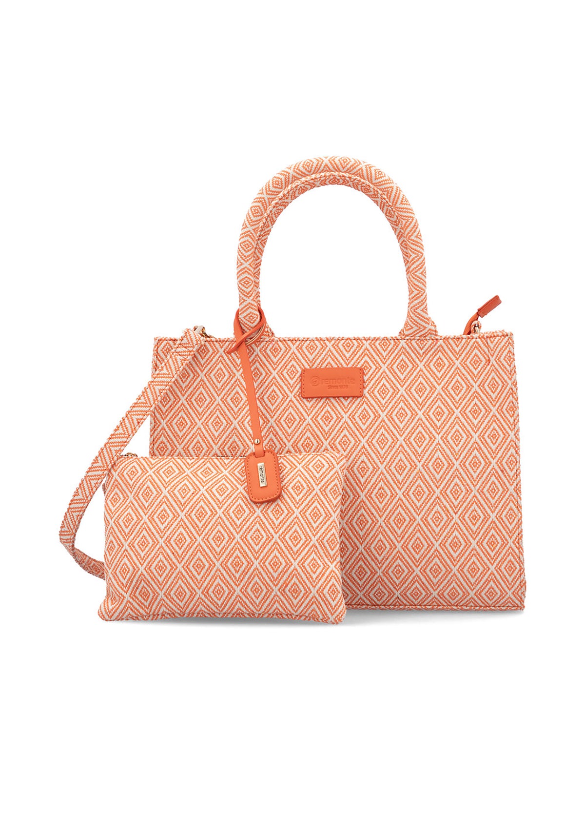 Ihastuttava laukku Remontelta! Kivan tilava käsilaukku, jota voi kantaa olalla erillisen olkahihnan kanssa. Yksinkertaisen tyylikäs tyyli, mutta niin kivan raikkaalla persikansävyisellä kuviolla. Mukana tulee muuten kiva pikku vetoketjullinen pussukka pikkutavaroille. Laukun sisällä on taskuja ja laukku suljetaan vetoketjulla. Ihana laukku moneen tyyliin ja menoon!