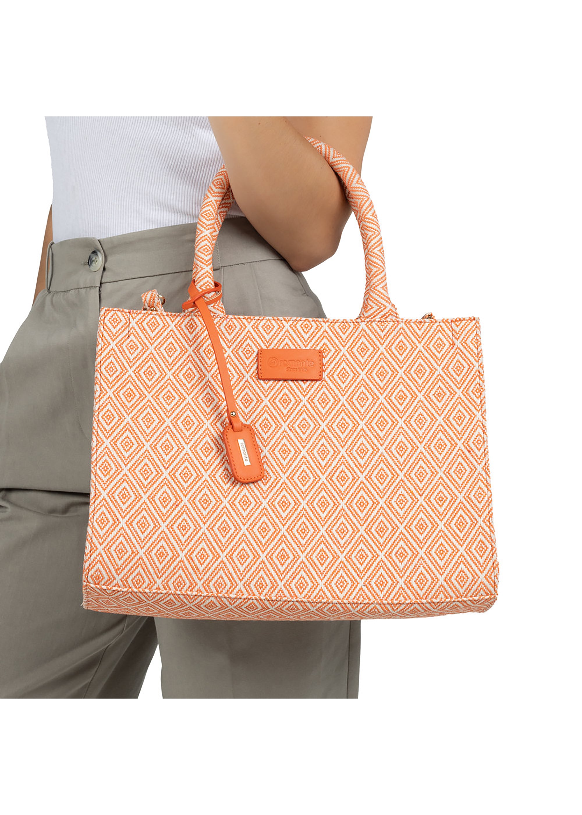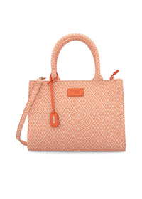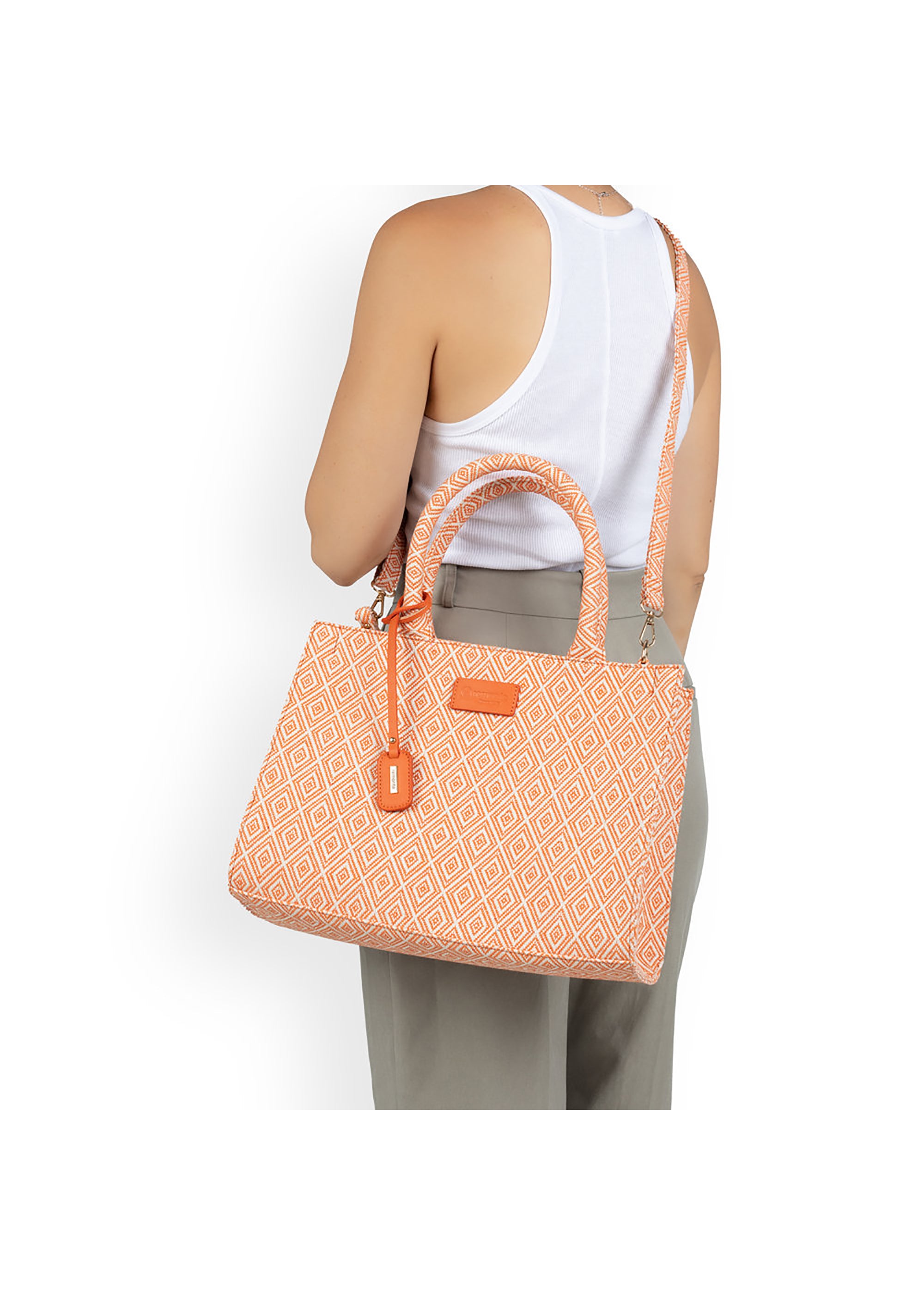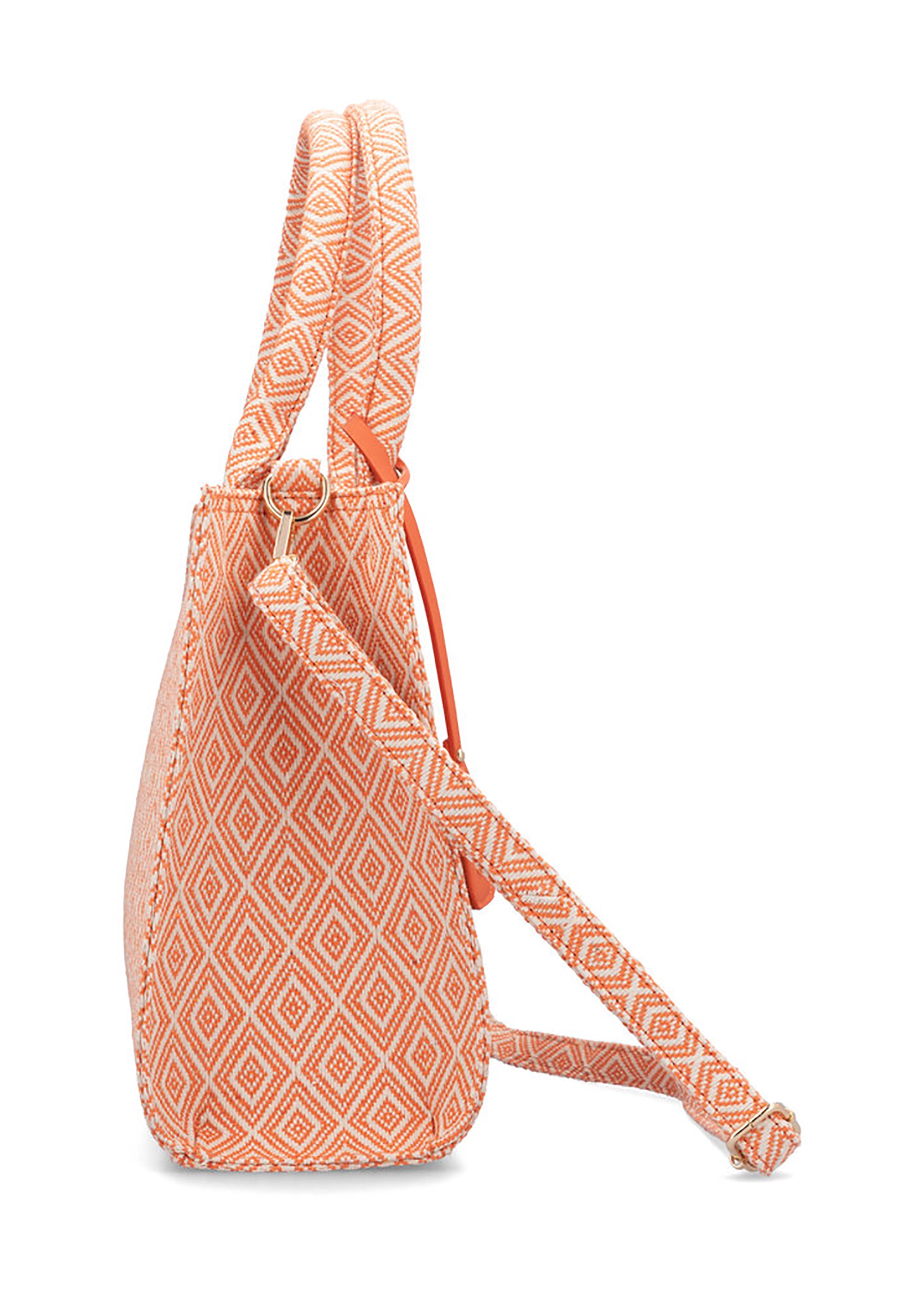 Ihastuttava laukku Remontelta! Kivan tilava käsilaukku, jota voi kantaa olalla erillisen olkahihnan kanssa. Yksinkertaisen tyylikäs tyyli, mutta niin kivan raikkaalla persikansävyisellä kuviolla. Mukana tulee muuten kiva pikku vetoketjullinen pussukka pikkutavaroille. Laukun sisällä on taskuja ja laukku suljetaan vetoketjulla. Ihana laukku moneen tyyliin ja menoon!