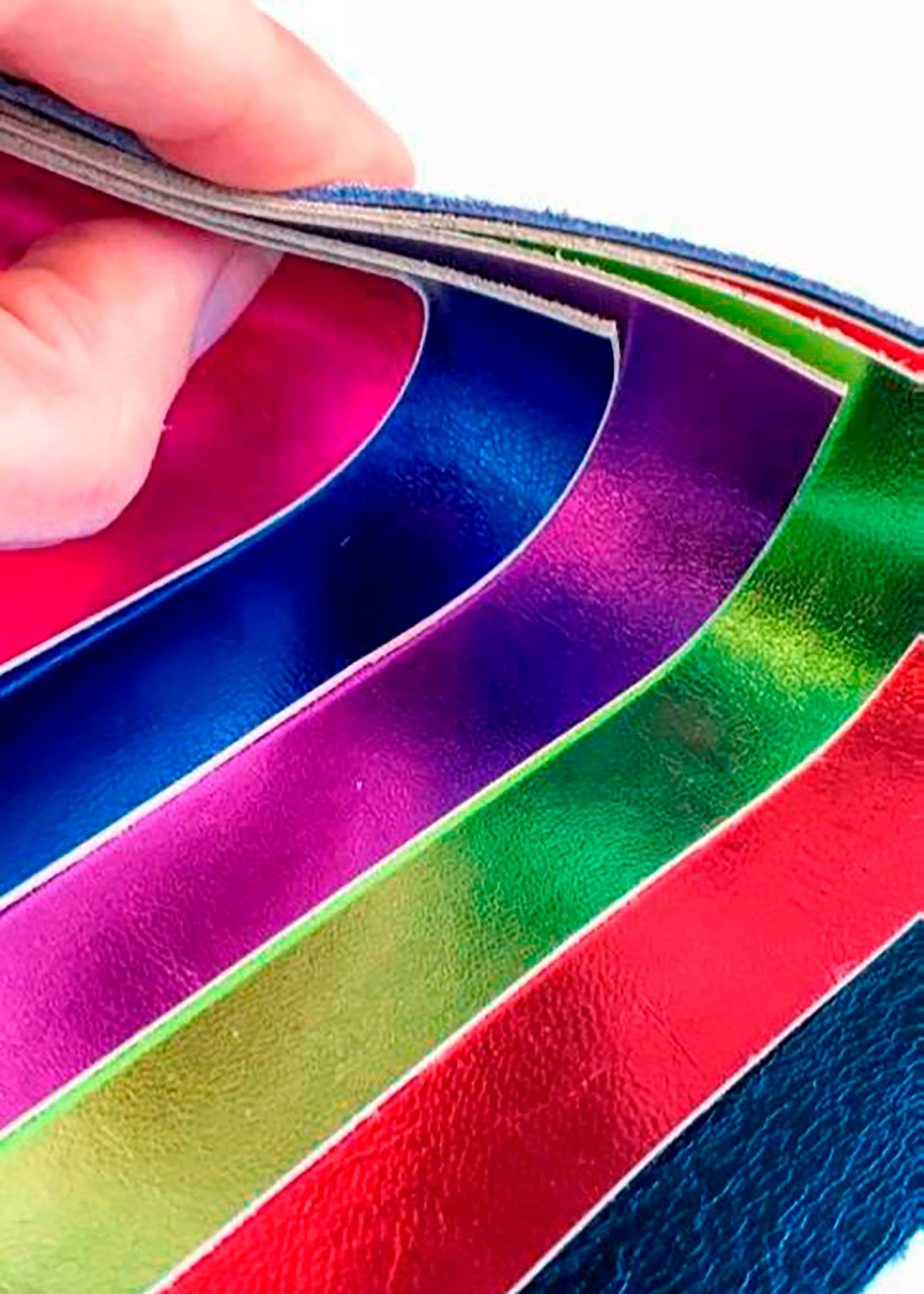 Vad är metallfärgat läder? Metalliskt läder syftar på en finish som skapar ett metalliskt utseende på lädret. Titta på ett exempel på metallfärgat läder i produktbilderna. Läders utseende uppnås genom att lägga till en syntetisk metallfilm på ytan eller genom att applicera en speciell lack som innehåller metallpulver på lädrets yta. Metalliskt läder används till exempel i skor och väskor.