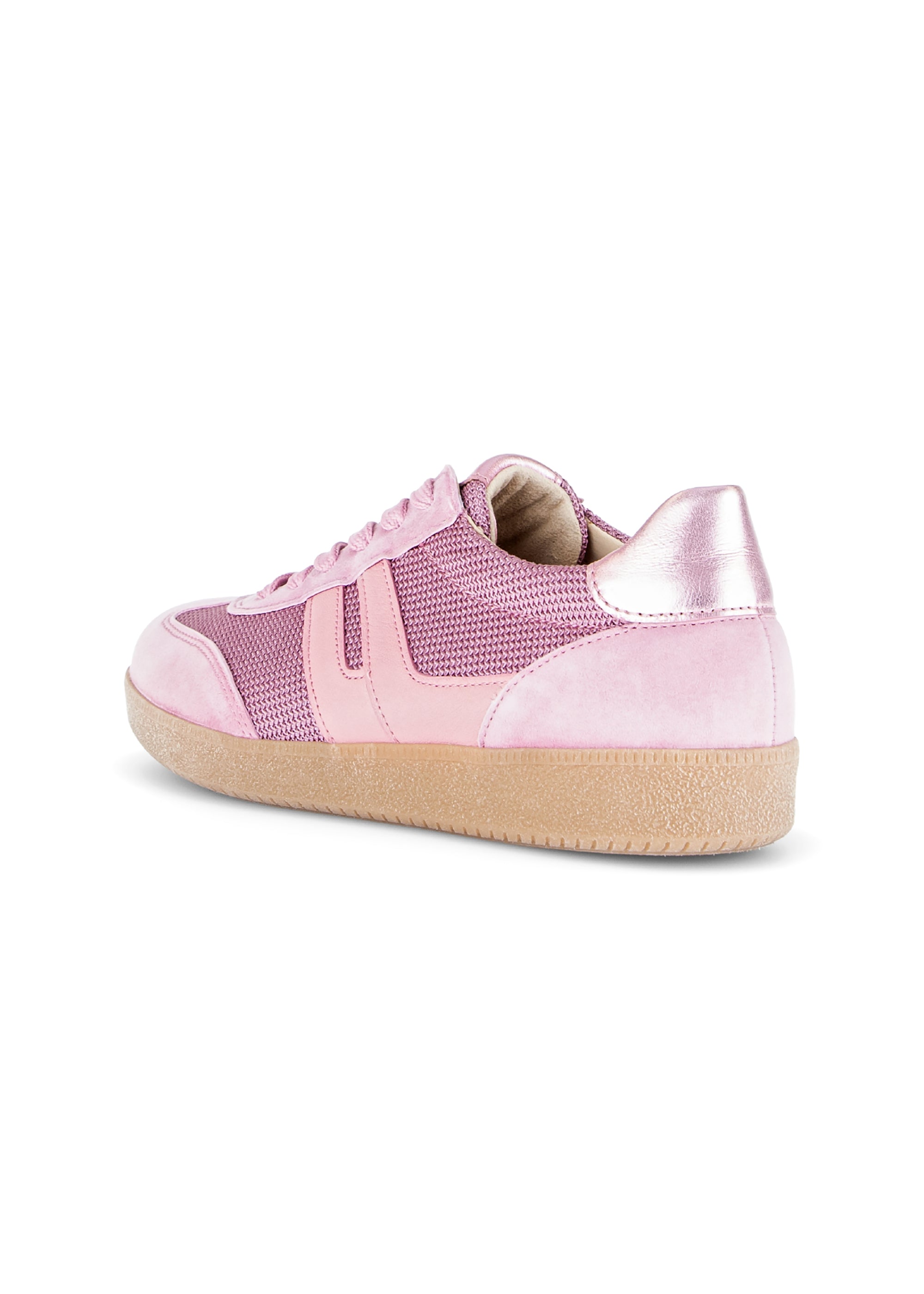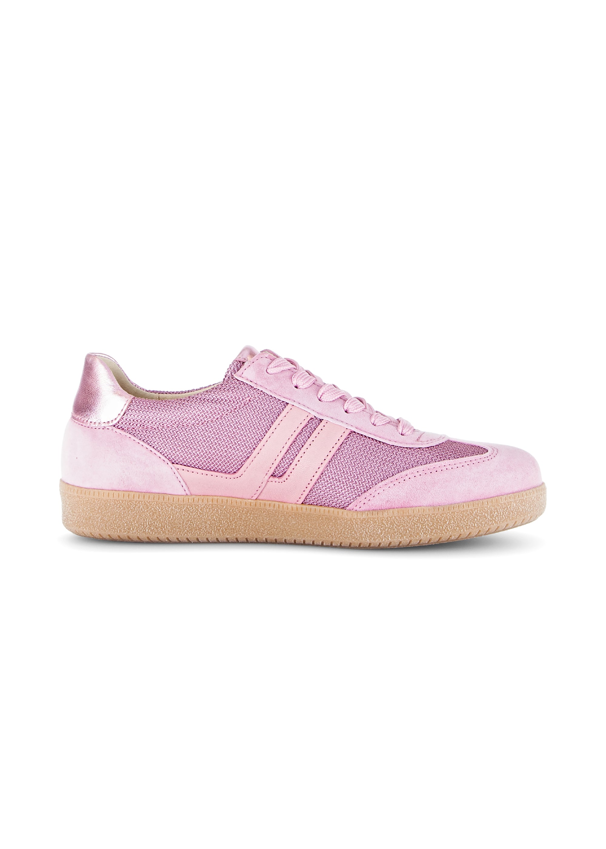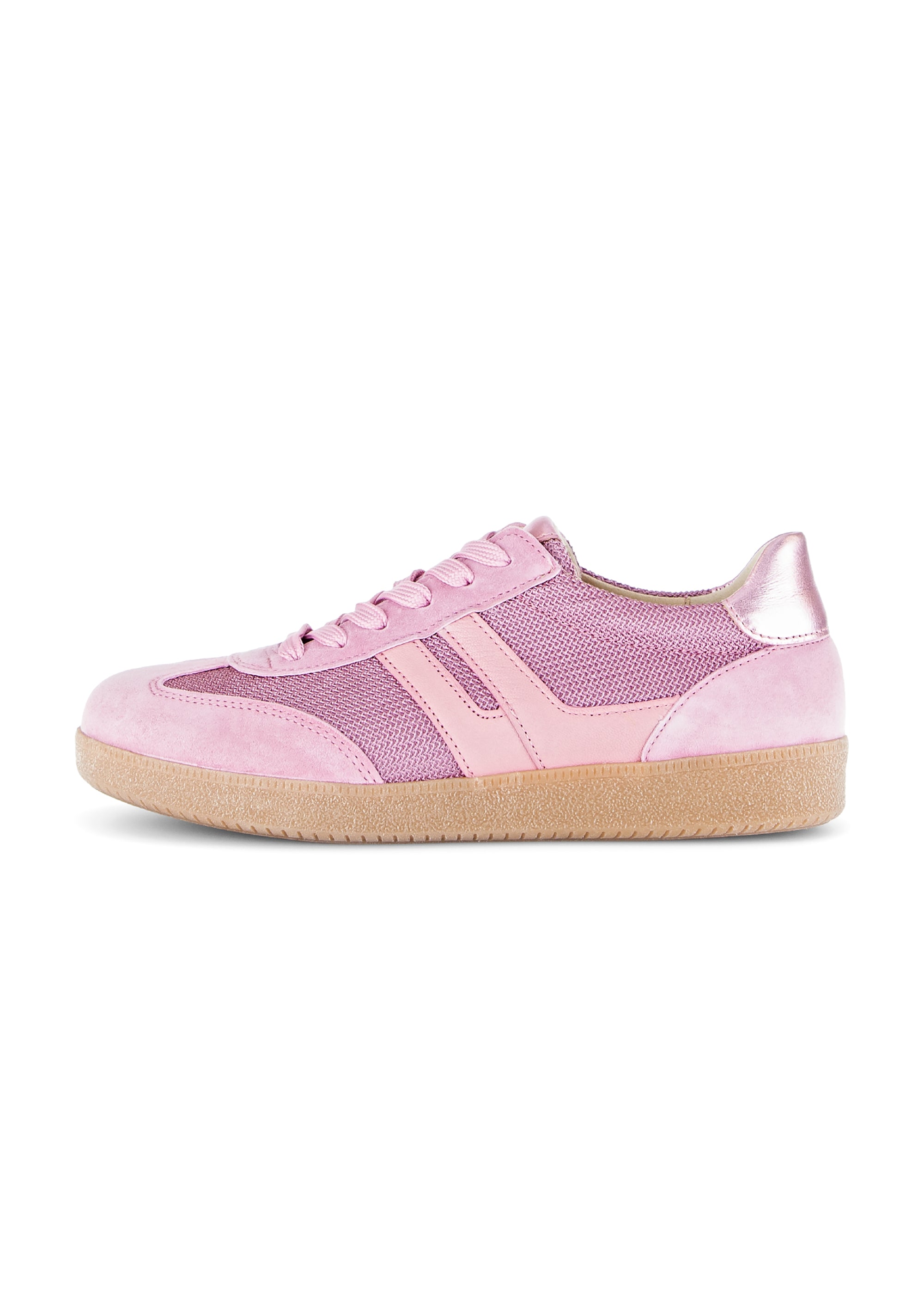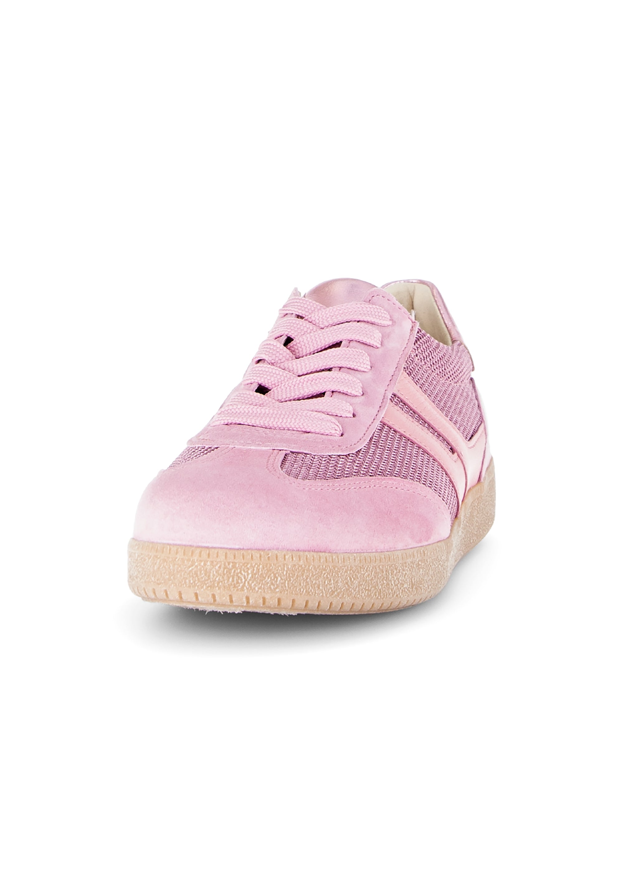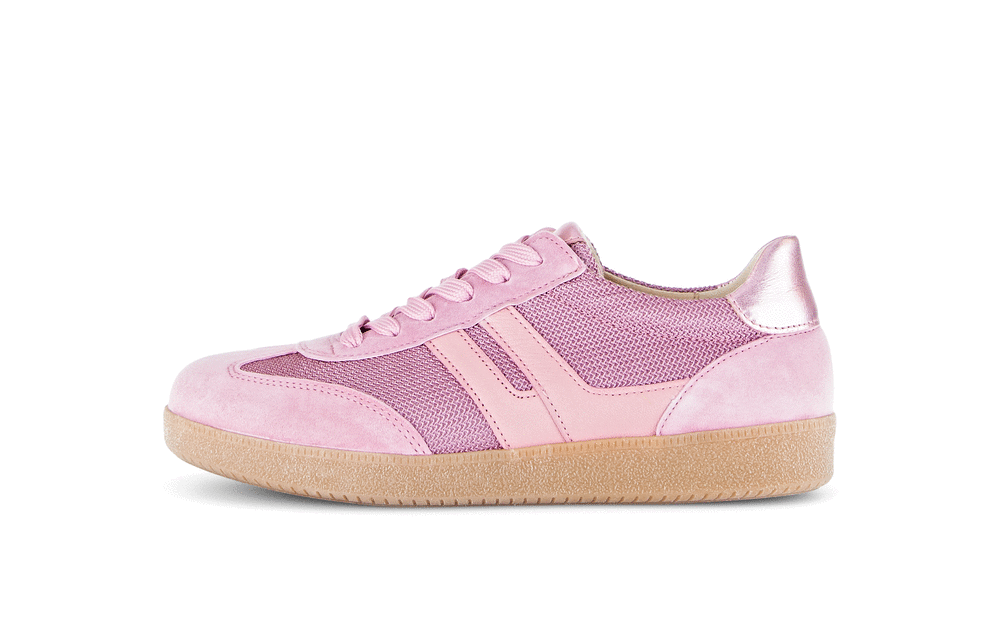 Underbara sneakers från Gabor! Trendiga sneakers med smal siluett nu i en ljusrosa nyans. Lite glansigt tyg på sidorna och en glansig läderkant vid hälen ger en fin skärpa och livar upp en annars mycket enfärgad look. Snörena kan justeras för en bekväm passform, likaså genom att byta inläggssula. De är härligt mjuka på foten, trendig elegans för vardagen!