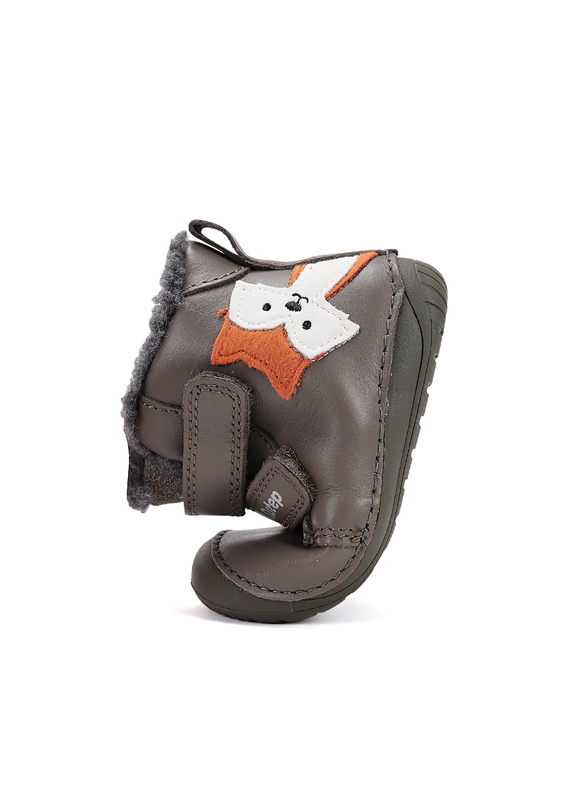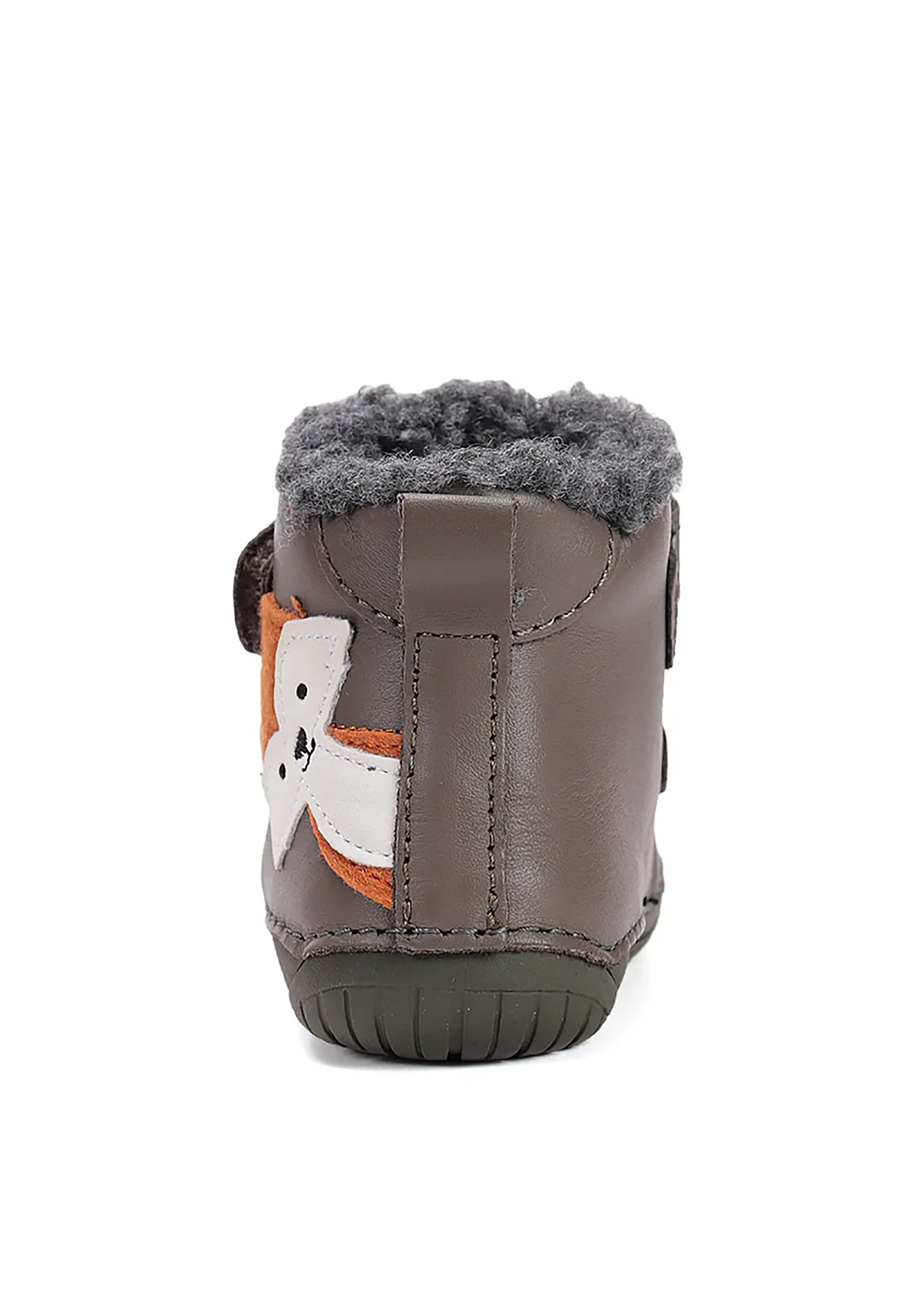 Barns barfotaskor - vinterkängor, grön läder, söt räv