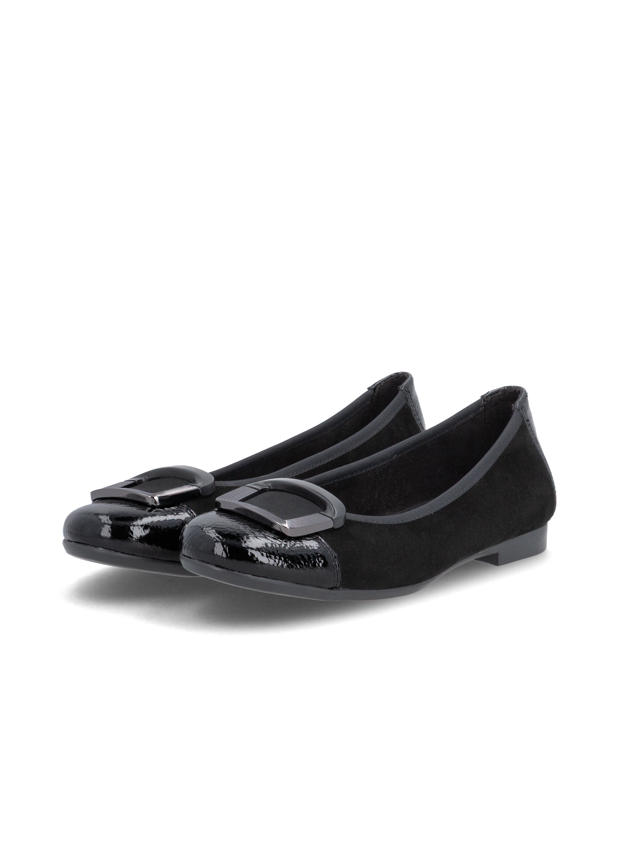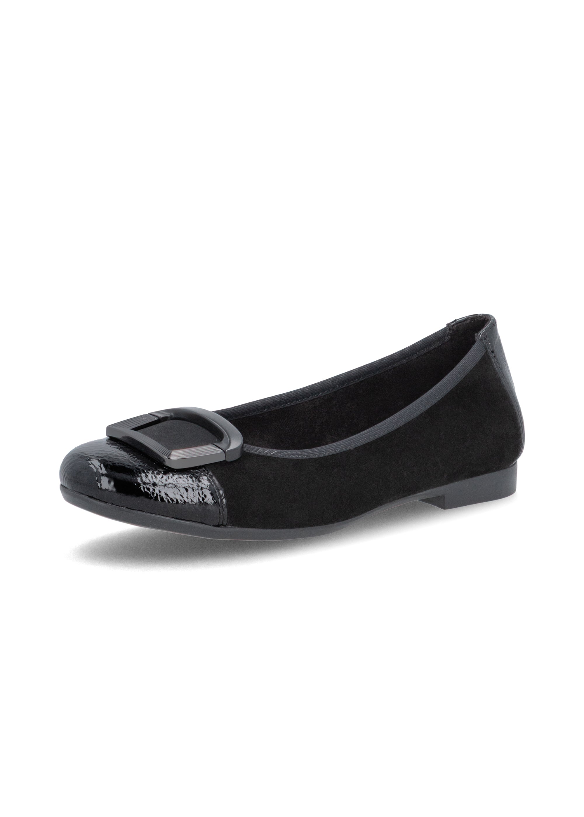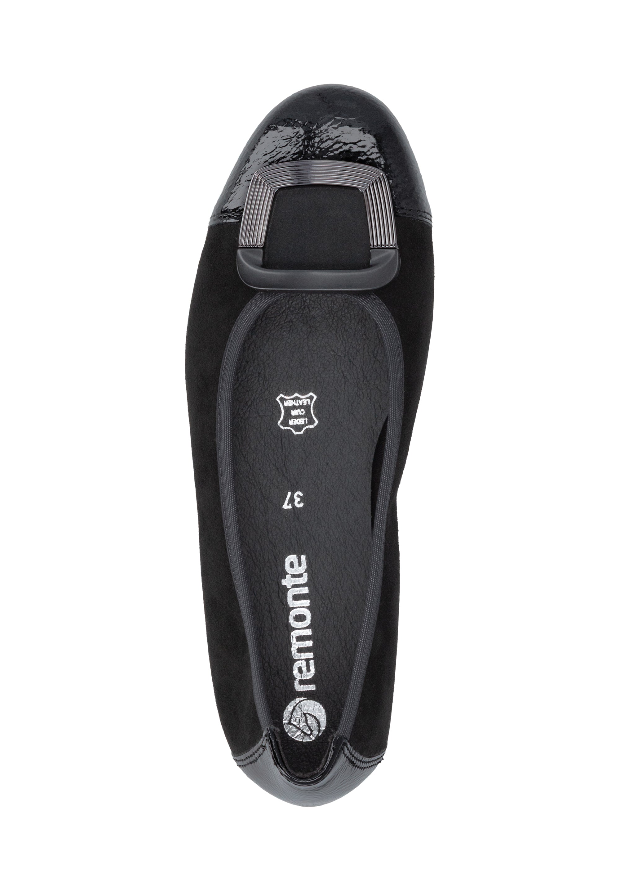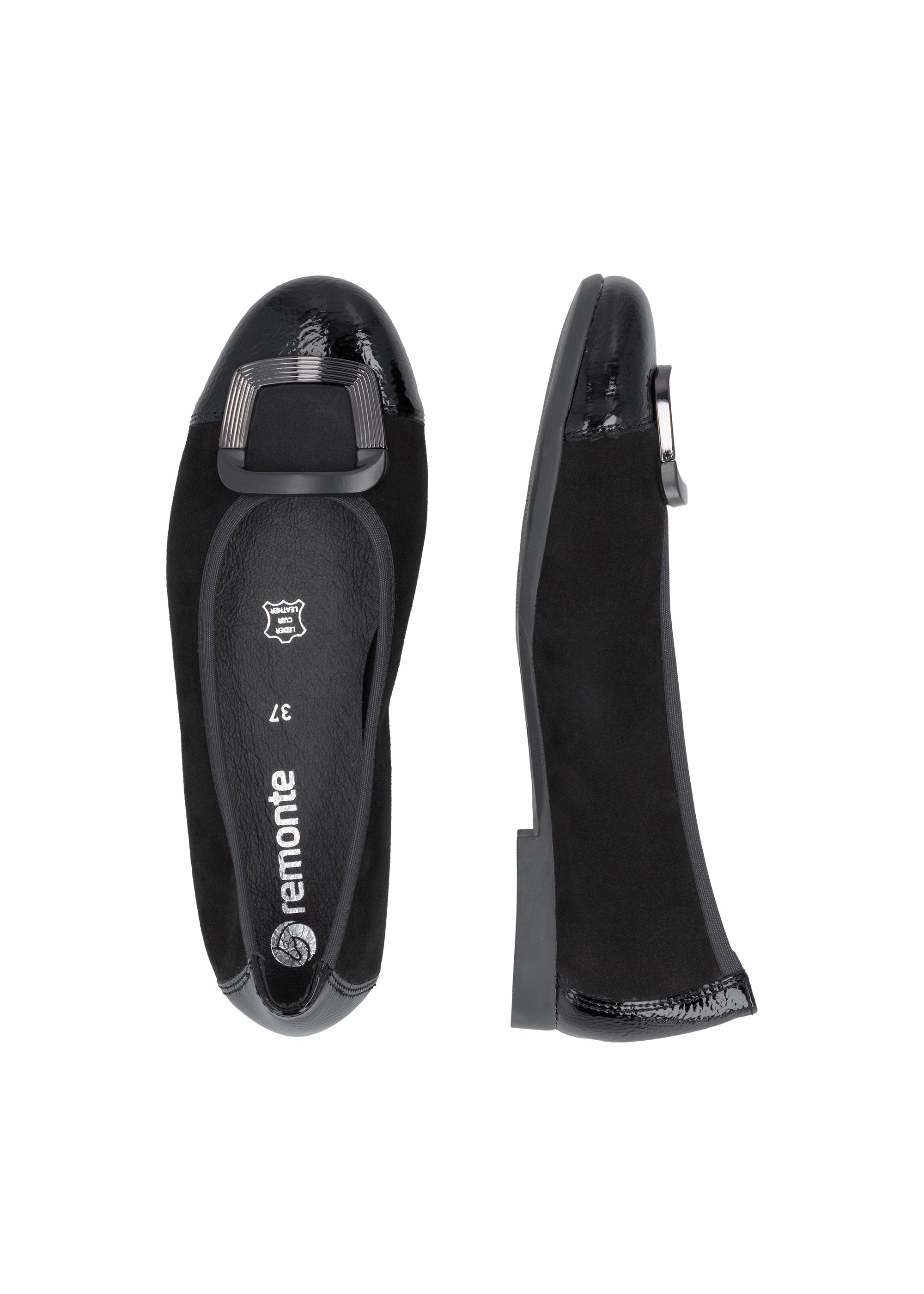 Underbara ballerinaskor från Remonte! En klassiskt elegant helt svart modell, en stor fyrkantig dekoration vid tån ger den sista touchen till den fina looken. Den låga klacken ger också en fin detalj till den annars låga sulan. Lädret är härligt mjukt, de är bekväma att ha på sig. Fina ballerinaskor för många outfits och tillfällen!