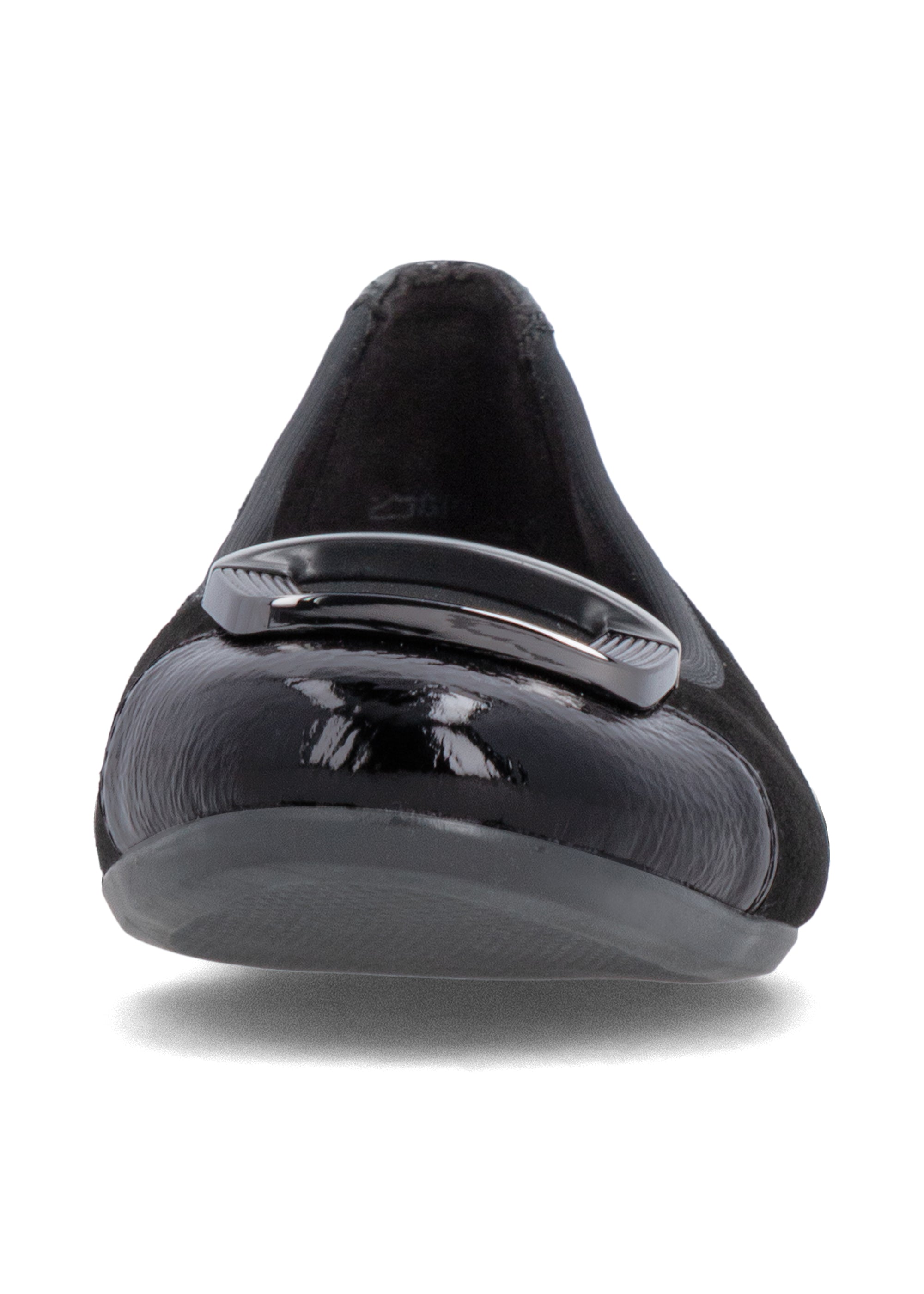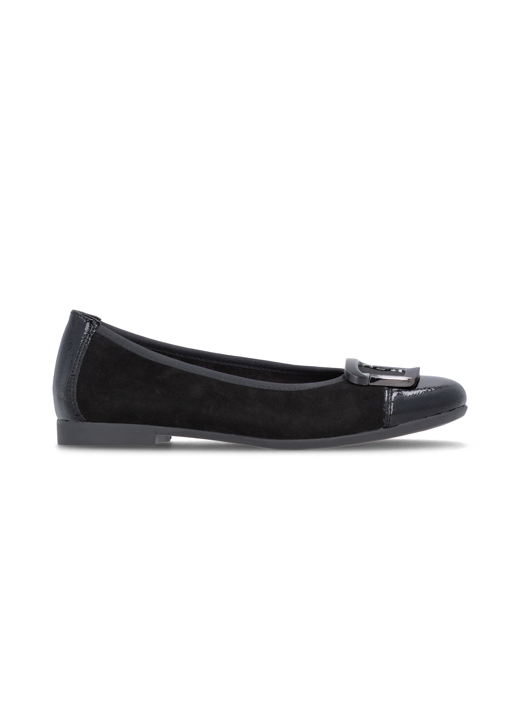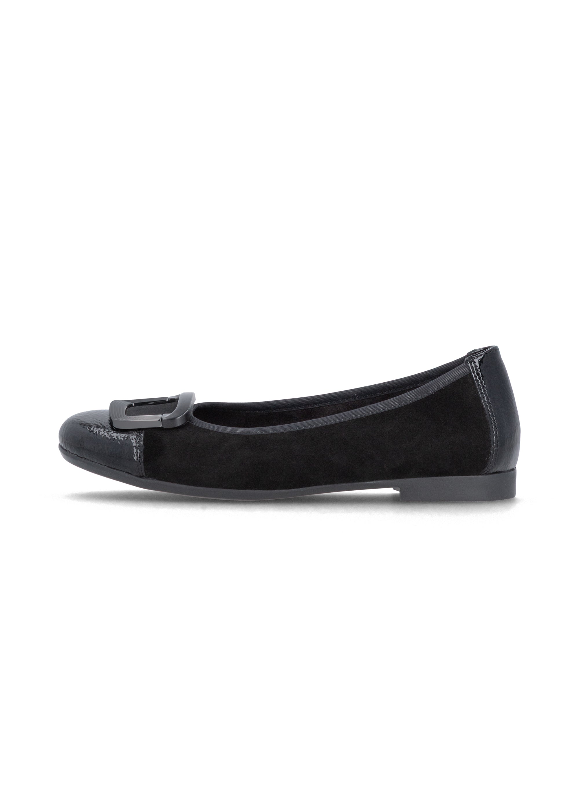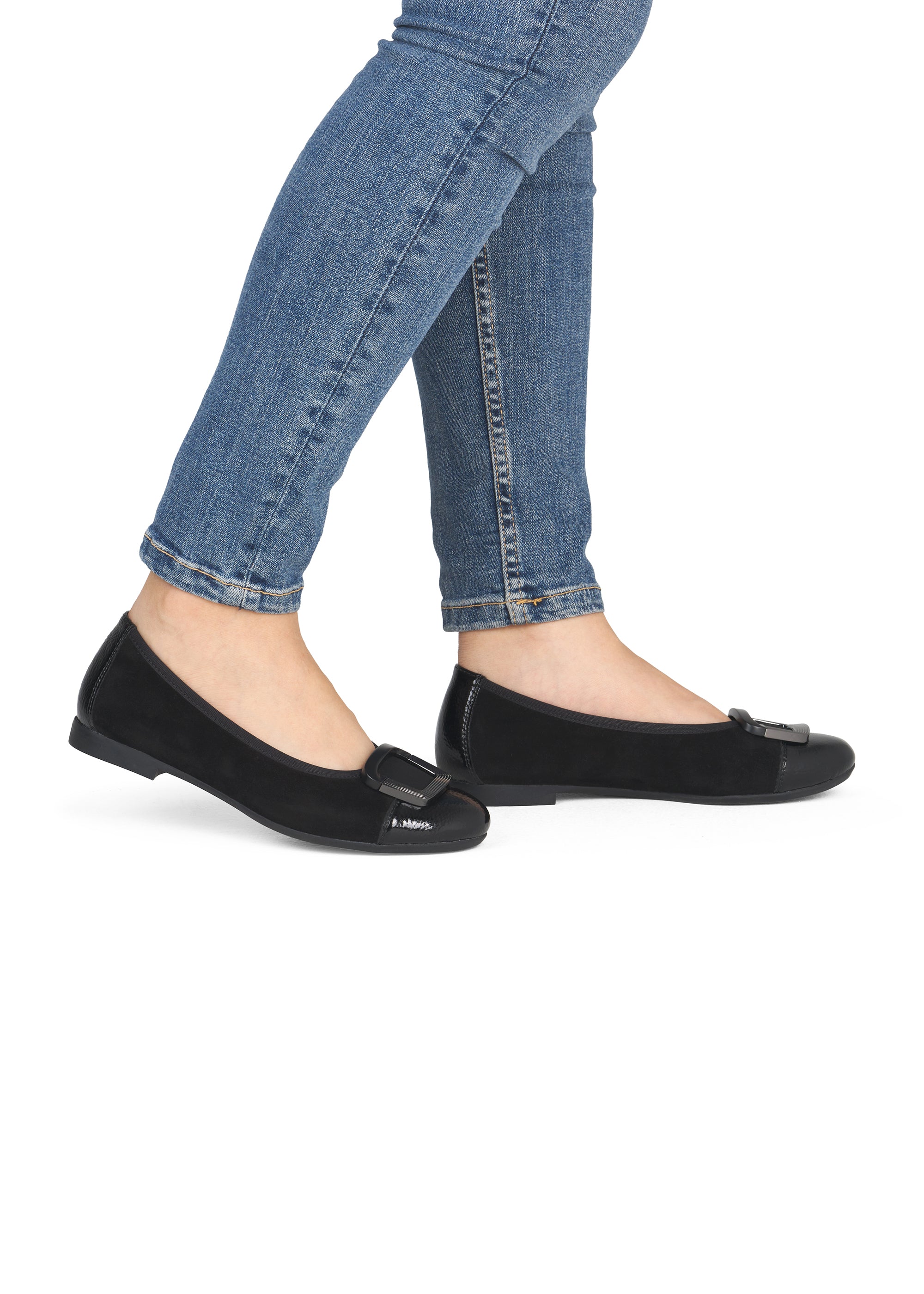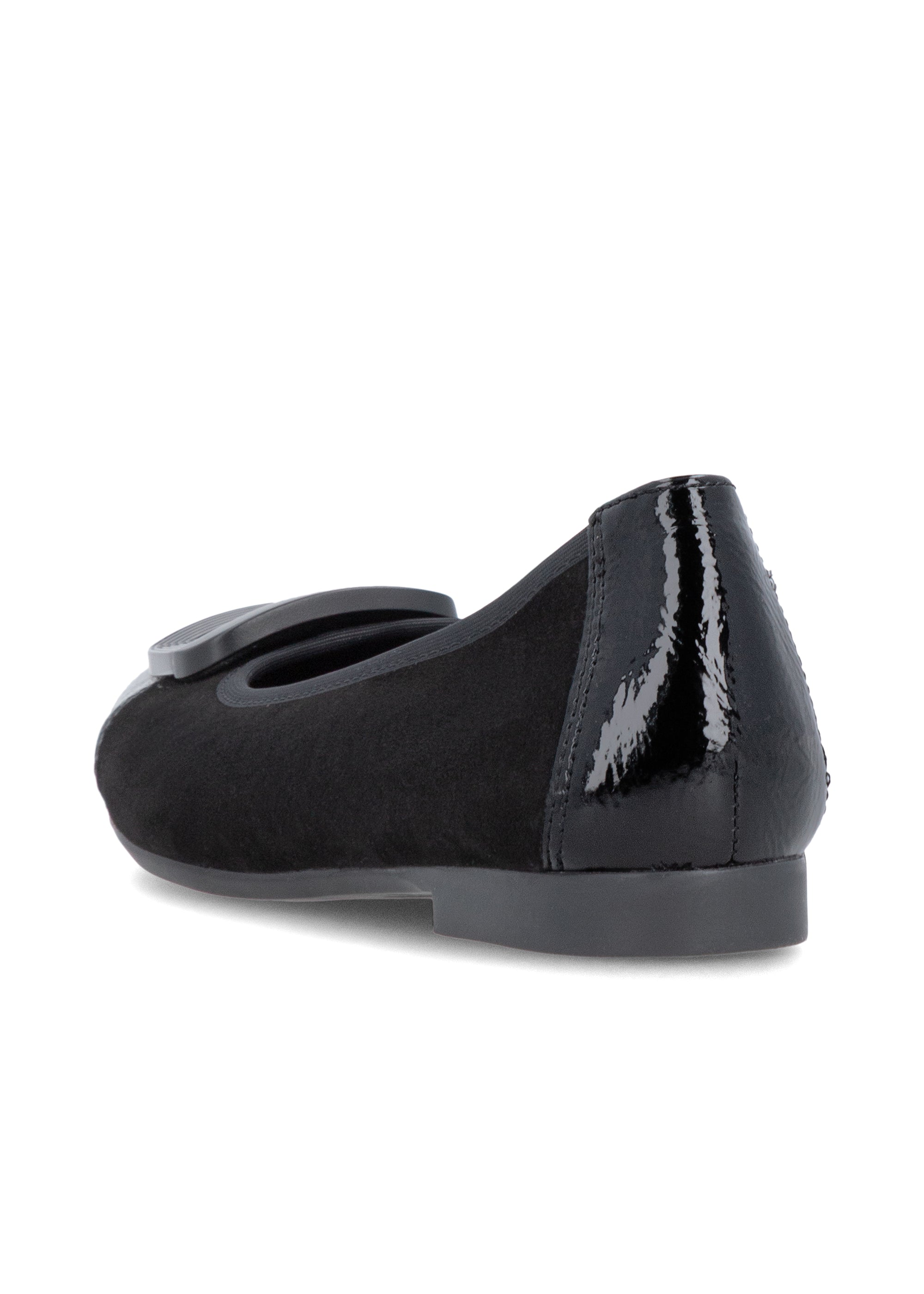Underbara ballerinaskor från Remonte! En klassiskt elegant helt svart modell, en stor fyrkantig dekoration vid tån ger den sista touchen till den fina looken. Den låga klacken ger också en fin detalj till den annars låga sulan. Lädret är härligt mjukt, de är bekväma att ha på sig. Fina ballerinaskor för många outfits och tillfällen!